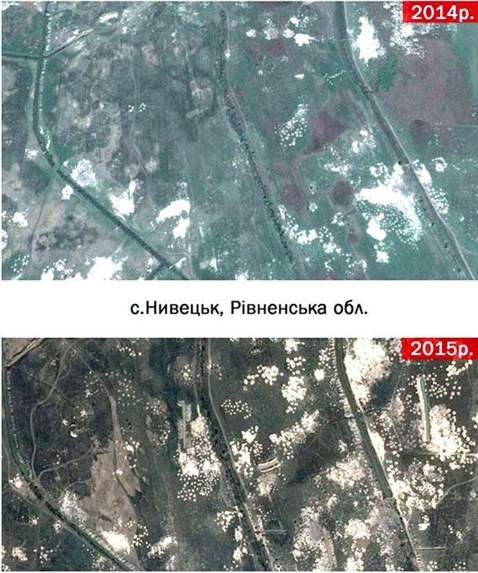 Це — 220 гектарів у Житомирській області, 4 гектари — у Волинській і 1691 — у Рівненській. за станом на сьогодні ці цифри значно зросли, вони змінюються щодня.