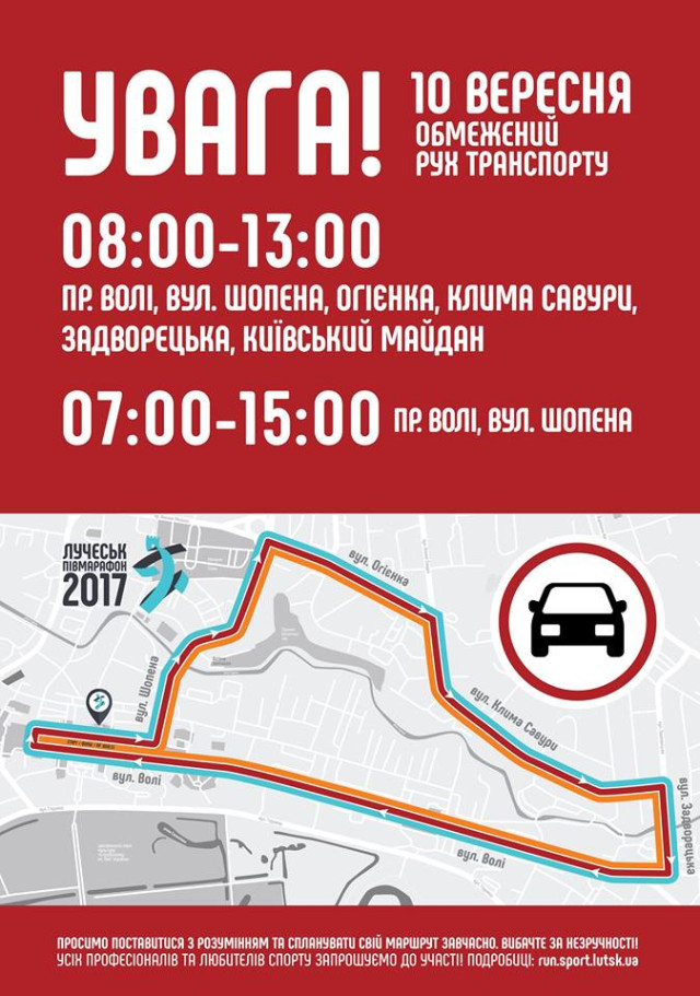 У зв’язку з цим рух автотранспорту на маршрутах змагання буде обмежено. Про це йдеться на сторінці Спортивний клуб «Лучеськ» у Фейсбуці.