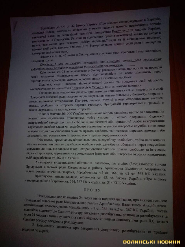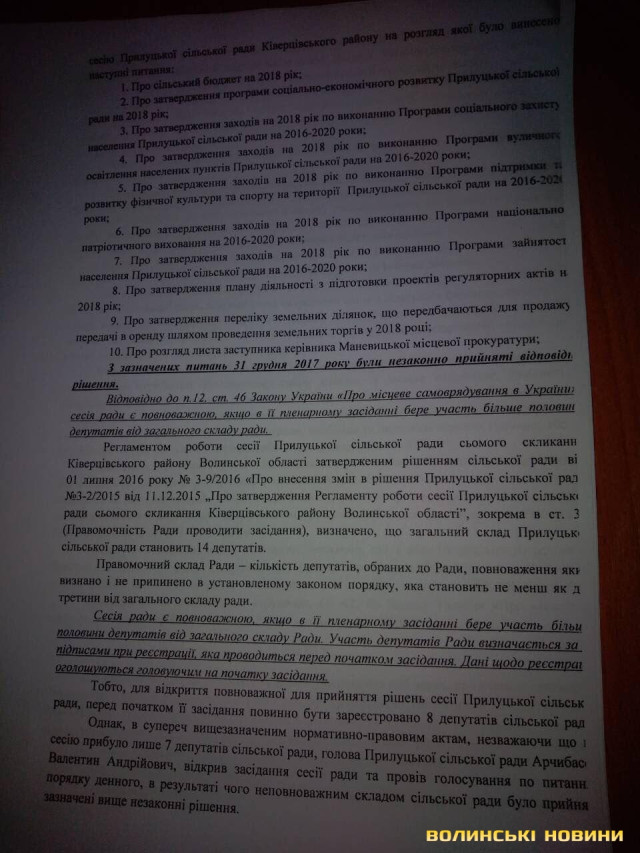 «На це голова сказав, що так, і навіть заявив, що готовий понести відповідальність за свої вчинки, у тому числі й перед прокуратурою», – розказав Валентин Матящук.Опісля цього депутати з групи «Воля громади», яка діє при Прилуцькій сільській раді, ініціювали подання заяв, де описали порушення, здійснені головою Прилуцької сільської ради.Невдовзі має розпочатися досудове розслідування в цій справі.
