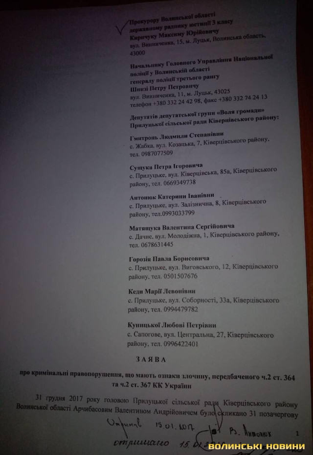 Нагадаємо, у зв’язку з неправомірними діями голови сільської ради Прилуцького Валентина Арчибасова депутати подали заяви в прокуратуру, поліцію та облраду, аби ті дали правову оцінку ситуації. Йдеться, наприклад, про те, що голова Прилуцького не виконує рішення сесій і проводить пленарні засідання без достатньої кількості депутатів.