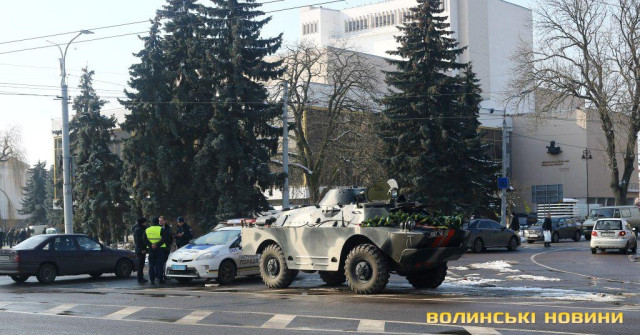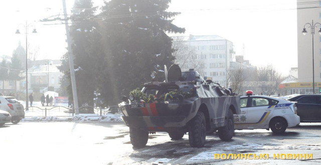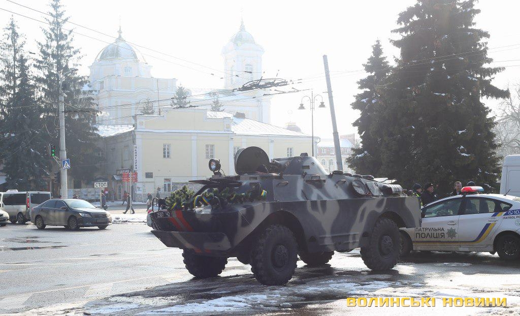 Увагу лучан у центрі міста 15 лютого привернуло значне скупчення автівок з іноземною реєстрацією та БРДМ – бойова броньована машина розвідувальних військ.