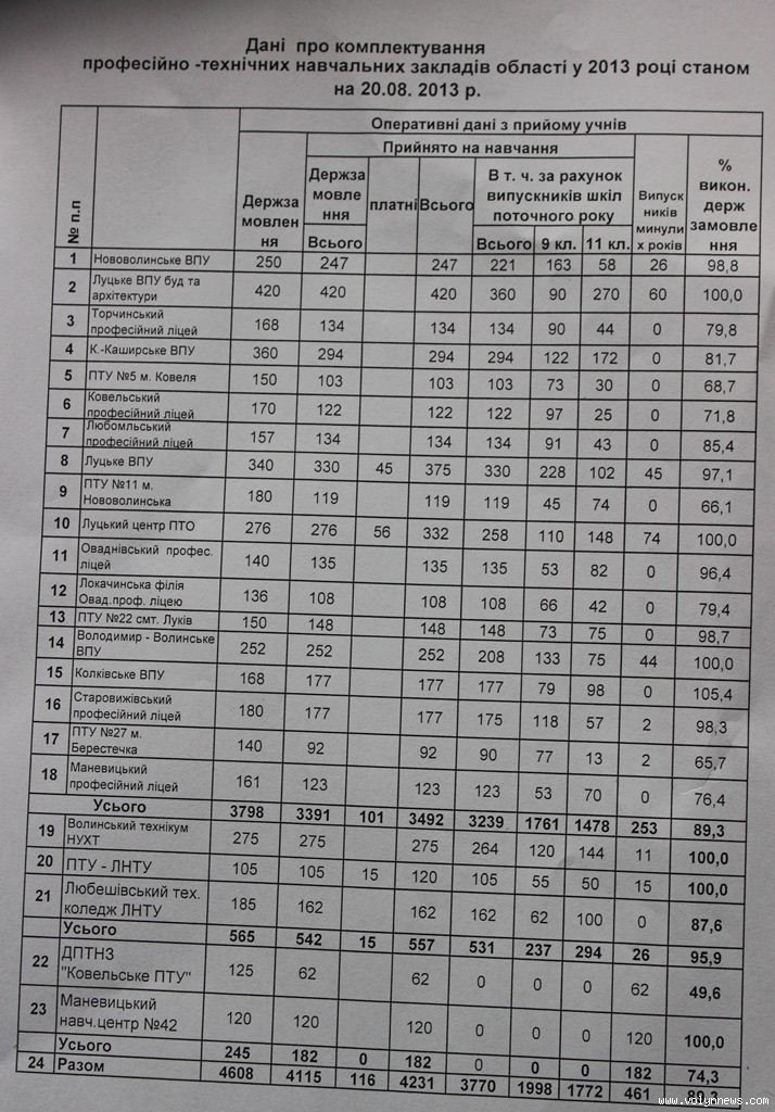 Зі слів освітян, загрозлива ситуація склалась із державним замовленням на окремі професії. Зокрема, ПТУ №11 у Нововолинську не забезпечило прийом учнів за напрямками - верстатник широкого профілю, формувальник ковбасних виробів, оператор лінії у виробництві харчової продукції; ПТУ № 5 за напрямком різьбяр по дереву, та інші.