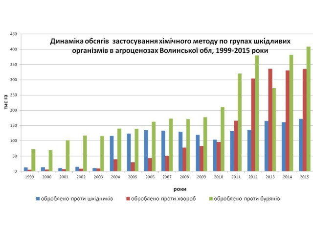 У зв’язку з потеплінням, що призвело до активізації шкідливих організмів, їх чисельності і шкодочинності, суттєво зросла кількість внесених засобів захисту рослин, що у свою чергу збільшує загрозу забруднення залишками пестицидів сільськогосподарської продукції. На цьому наголосив Василь Боярин – кандидат с/г наук, начальник відділу прогнозування, фітосанітарної діагностики та аналізу ризиків головного управління Держпродспоживслужби у Волинській області. За останні 15 років обсяги застосування хімічного методу проти бур’янів зросли більш як у вісім разів, проти шкідників – майже у 20 разів, проти хвороб – більш як у 30 разів. Він наголосив на необхідності інформувати сільгоспвиробників усіх форм власності щодо дотримання регламентів застосування хімічних засобів захисту рослин і впровадження натомість біологічних.