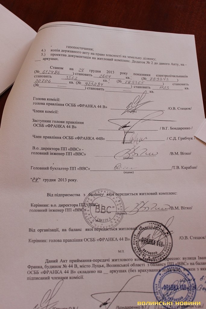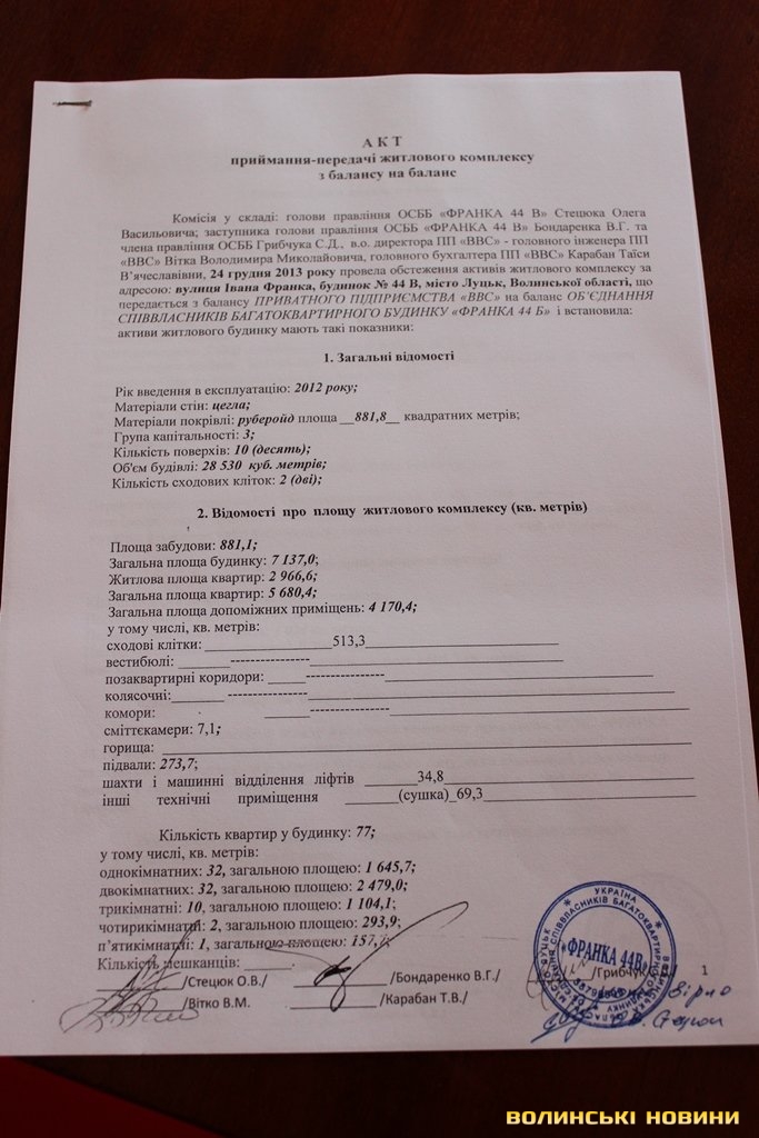 У липні 2012 року новобудова за цією адресою отримала документ про те, що споруда вже готова до заселення мешканців. Замовником та підрядником об’єкту виступало ПП «ВВС», зареєстроване в Луцьку за адресою вулиця Сосюри, 2. Варто наголосити, що житло на Франка, 44в – кооперативне, тобто забудовник розпоряджався не лише власними коштами.