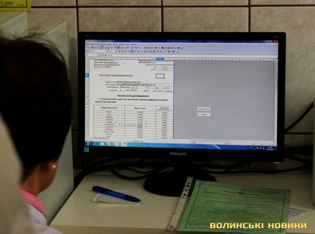 Фахівець здійснила дослідження проби природного газу з газорозподільчої станції Ковель. Аналіз зразка триває приблизно 20 хвилин і пристрій автоматично видає результат – хроматограму з концентрацією. Проба газу відстоялася певний час у приміщенні, набравши відповідної температури, після чого балон з пробою під’єднали до приладу, щоб отримати хроматограму. Так, допускається наявність до 2% вуглекислого газу, до 3% азоту та не менше 90% метану.Щоранку хроматограф калібрують, для цього використовуючи повірочні газові суміші. Застосовують різні суміші, відповідно до того, який газ досліджуватимуть (адже його отримують з чотирьох газопроводів). Виготовляє повірочні суміші ДП «Укрметртестстандарт». До слова, щодо природного газу, який видобувають на Волині, фахівець зазначила, що локачинський газ має калорійність понад 8 тисяч кілокалорій на метр кубічний, має вищу густину від, наприклад, російського газу, а також не містить вуглекислого газу.Хімік запевнила, що за всі роки роботи у лабораторії жодного разу не фіксувала випадків, коли калорійність газу для волинських споживачів була б нижчою від допустимої норми – показник калорійності завжди перевищував 8000 кілокалорій на метр кубічний за норми 7600.