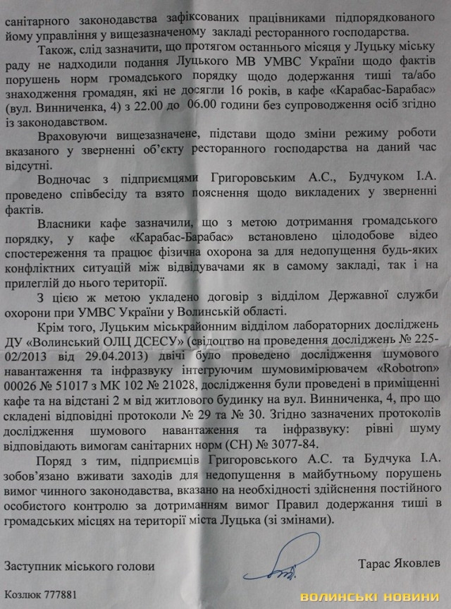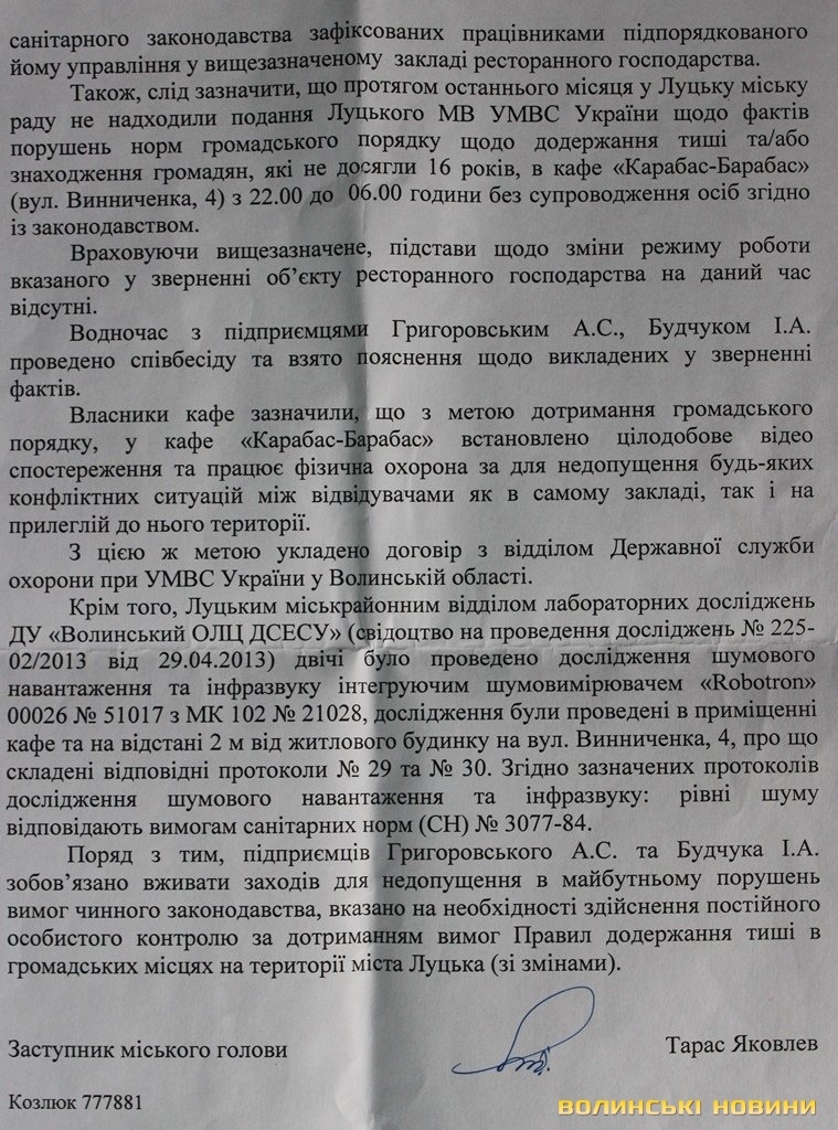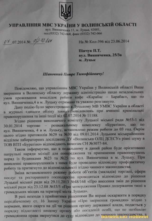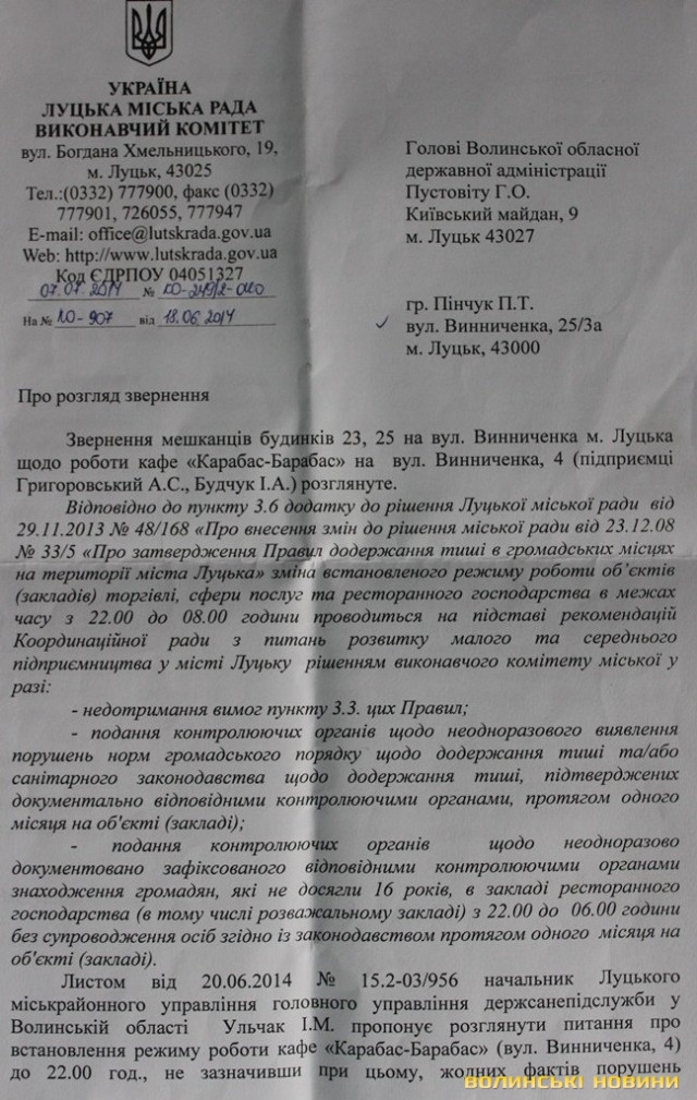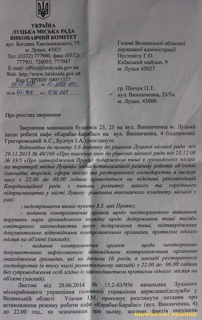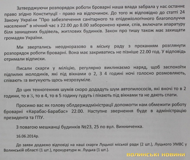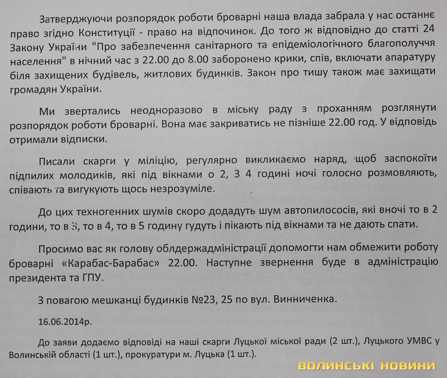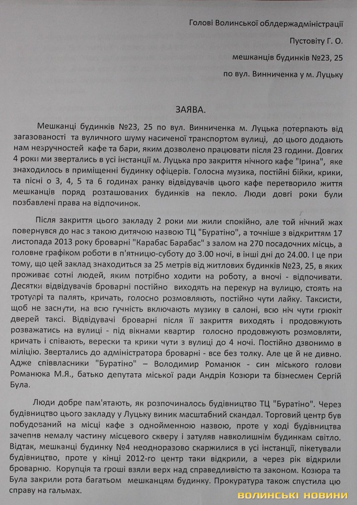 «Мешканці будинків № 23,25 на вулиці Винниченка потерпають від загазованості та вуличного шуму насиченої транспортної вулиці, до цього додають незручностей кафе та бари, які працюють після 23-ї. Зокрема 17-го листопада 2013-го року відкрили броварню «Карабас-Барабас», в п’ятницю і суботу вони працюють до 3.00 ночі, в будні до 24.00. Це при тому, що заклад знаходиться 25 метрів від житлових будинків. Десятки відвідувачів броварні постійно виходять на перекур на вулицю, голосно розмовляють, лаються. Під вікнами стоять таксисти й гучно слухають музику. До 4 ночі чути верески й крики відвідувачів та їхні співи. Зверталися до адміністратора закладу – безрезультатно. Але це не дивно, бо співвласник «Буратіно», де знаходиться пивнушка, - Володимир Романюк – син Луцького міського голови Миколи Романюка. Ми зверталися в різні інстанції, поки без толку. Неодноразово й викликали міліцію через крики відвідувачів. Просимо Вас обмежити роботу закладу до 22.00 години».Втім, розповідає лучанин Петро Пінчук, звернення перенаправили в Луцьку міську раду, де й «прикривають» цей бізнес, тому цього місяця отримали чергову відписку.