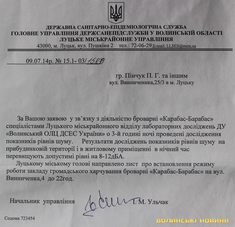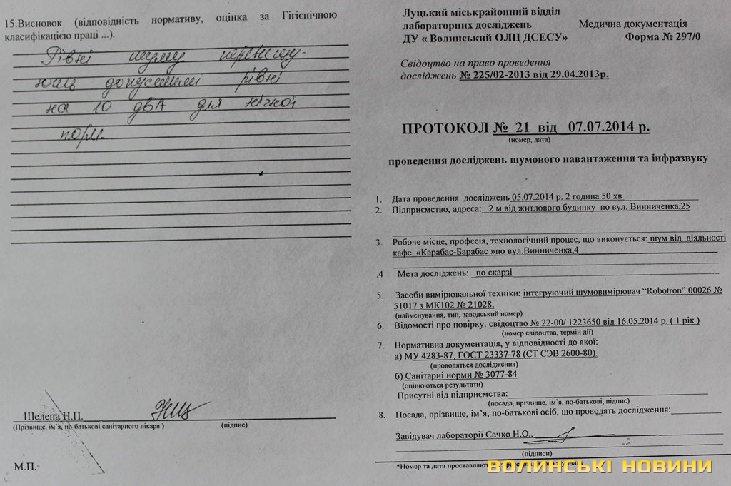 «Згідно з протоколами № 29 та № 30 від 09.01.2014-го року Луцьким міськрайонним відділом лабораторних досліджень ДУ «Волинська ОЛЦ ДСЕСУ» рівні шуму в ТОВ ВТП «Буратіно» відповідають вимогам СН №3077-84. Також інформуємо, що в подальшому в даний район буде орієнтовано патрульні наряди міліції для попередження та припинення правопорушень поряд із будинками № 23 та № 25 по вулиці Винниченка в місті Луцьк».Однак, про те, що шум перевищує допустимі норми у зв’язку з роботою броварні «Карабас-Барабас», підтверджують нещодавні дослідження санепідемслужби.«Спеціалістами Луцького міськрайонного відділу лабораторних досліджень о 3-й годині ночі проведені дослідження показників рівнів шуму. Результати досліджень показників рівнів шуму на прибудинковій території і в житловому приміщенні в нічний час перевищують допустимі рівні на 8-12дБА», - йдеться у висновках.Так, Луцькому міському голові направили лист про становлення режиму роботи закладу на вулиці Виннниченка, 4 до 22.00 години.