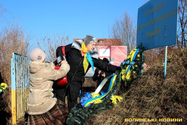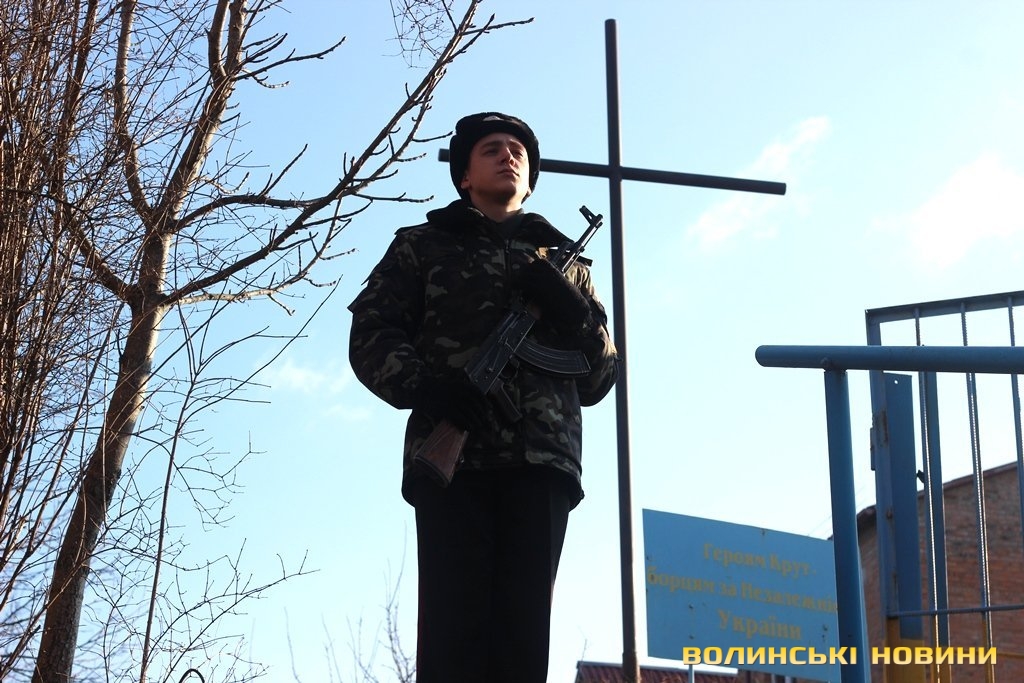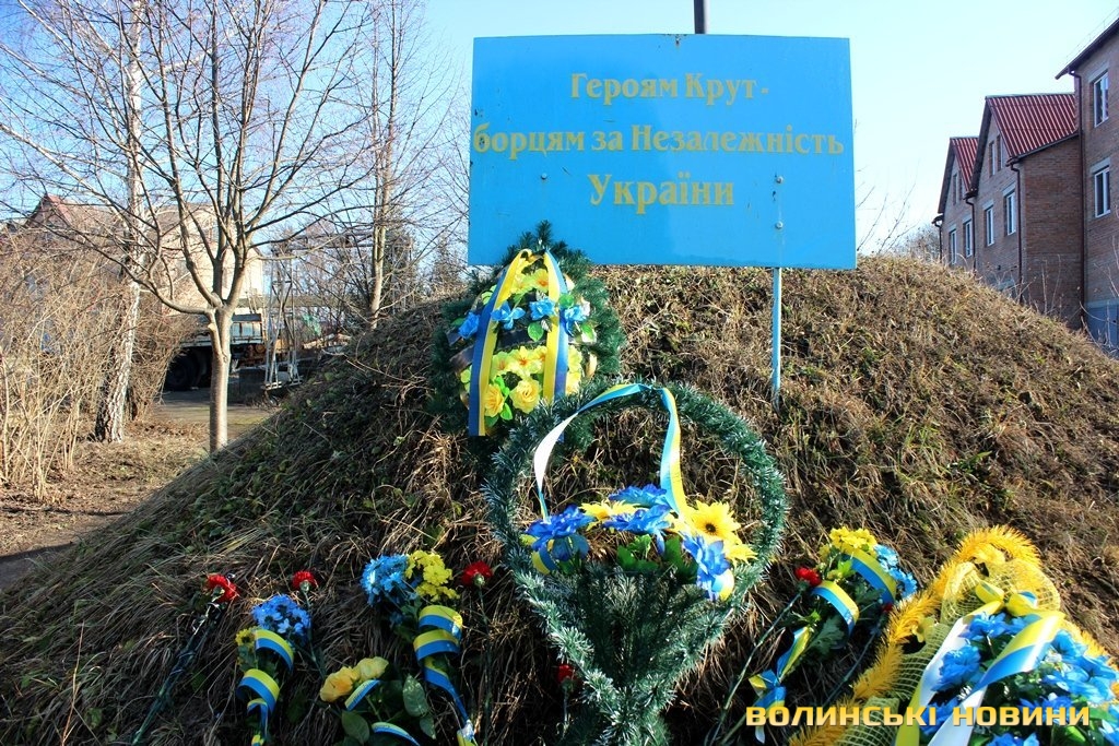 Перший пам’ятний знак Героям, полеглим під Крутами, встановили у Луцьку. Ініціатором встановлення цього хреста на імпровізованій високій могилі став лучанин Іван Мирка, чий дід пішов за покликом своєї країни і не повернувся з того бою. 2006 року напередодні Дня Незалежності України в пам’ять про подвиг діда Іван Мирка зініціював спорудження на своїй приватній території могили з хрестом. Він насадив там калину і фруктові дерева. З того дня щороку сюди приходять лучани аби вшанувати полеглих. Прийшли вони й сьогодні, 29 січня, в 97-му річницю бою під Крутами.Історія про учня Рогатинської гімназії Михайла у їхній родині передавалася з покоління в покоління. Коли уряд УНР покликав боронити Київ, він одразу ж сказав рідним, що йде туди, навіть тодішній польський уряд це дозволяв. З-під Крут він не повернувся, розповідає син автора пам’ятного знаку, правнук полеглого під Крутами бійця Іван Іванович Мирка. Нині, до слова, він працює на посаді начальника управління інфраструктури, транспорту та зв’язку облдержадміністрації.