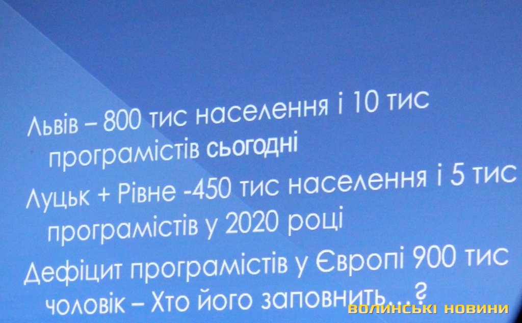 Амбітна задача, яку ставлять перед собою у Луцьку – до 2020 року працевлаштування 5 тисяч айтішників у Луцьку та Рівному. Зі слів Петра Гоцалюка, це цілком реально, адже в Європі спостерігають дефіцит програмістів – 900 тисяч вакансій заповнюють індуси, аргентинці та представники інших націй, тож, на його думку, претендувати на ці вакансії зможуть і волиняни. Для розвитку ІТ-галузі у Луцьку, з його слів, важливим є брендинг.Своєю чергою, експерт зі Львова Андрій Пундор повідомив, що багато вирішує співпраця бізнесу з міською владою. Так, з його слів, у сучасних умовах принцип «не заважати» з боку міської влади недостатній для того, щоб місто досягло успіху.