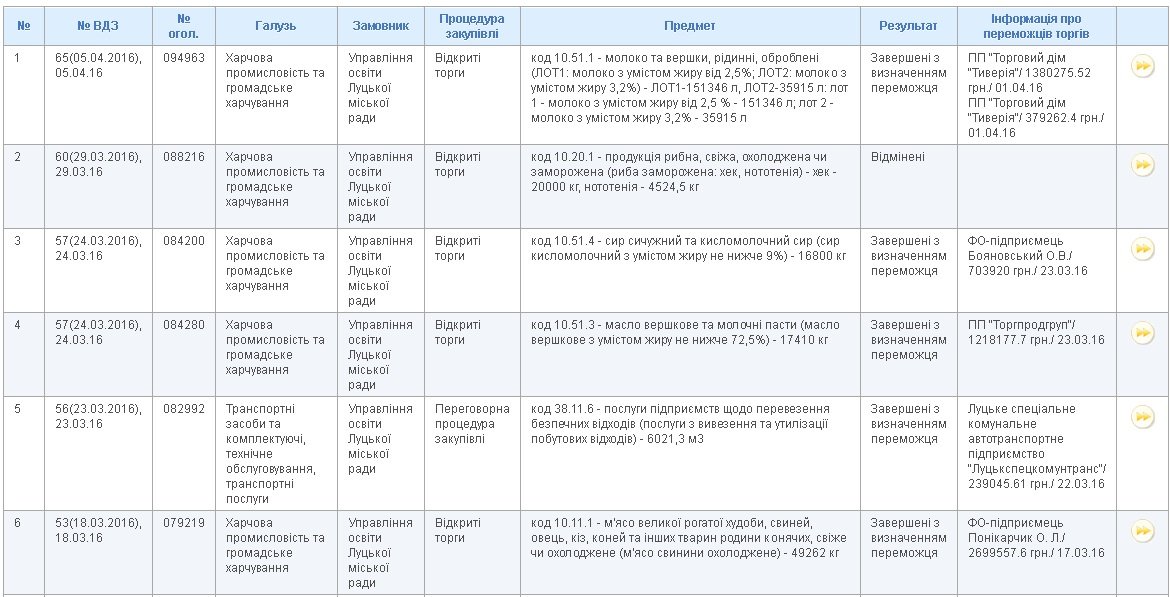 – кисломолочний сир – 41,9 грн. за кг., (постачальник ‒ підприємець Бояновський О.В, Луцьк);