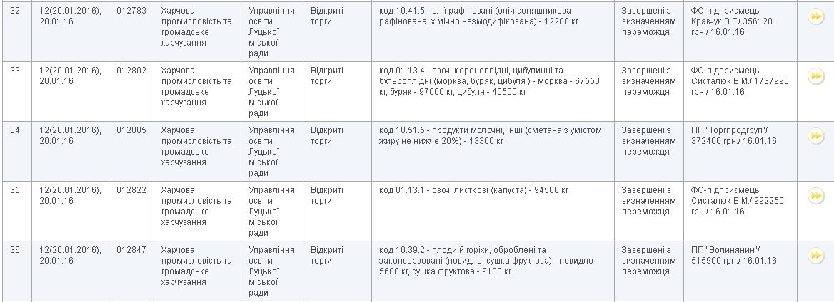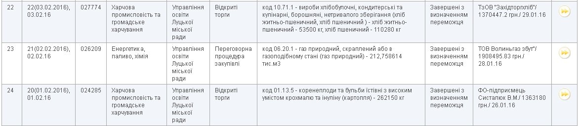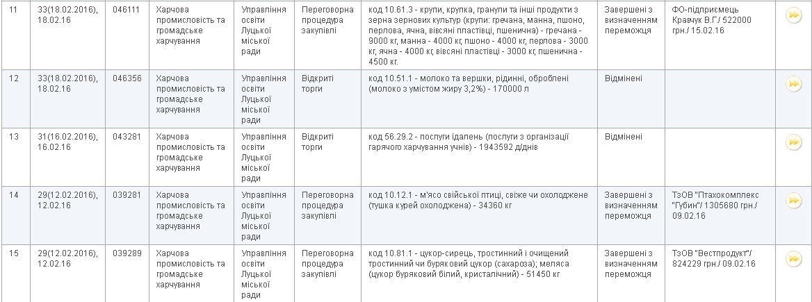 ‒ крупи : гречана – 9000 кг, манна – 4000 кг, пшоно – 4000 кг, перлова – 3000 кг, ячна – 4000 кг, вівсяні пластівці – 3000 кг, пшенична – 4500 кг. – 522 000 грн. (постачальник – Кравчук В.Г, м. Луцьк);