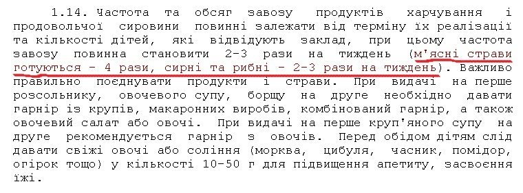 Орієнтовний об’єм готових страв та окремих продуктів для дітей різних вікових груп (у грамах):Наведена інструкція з організації харчування дошкільнят передбачає, що діти повинні 4 рази в тиждень їсти м’ясні страви, сирні та рибні ‒ 2-3 рази:Ще одним цікавим пунктом міністерської інструкції є обов’язкове збагачення страв вітаміном С, яке здійснюється аскорбіновою кислотою.