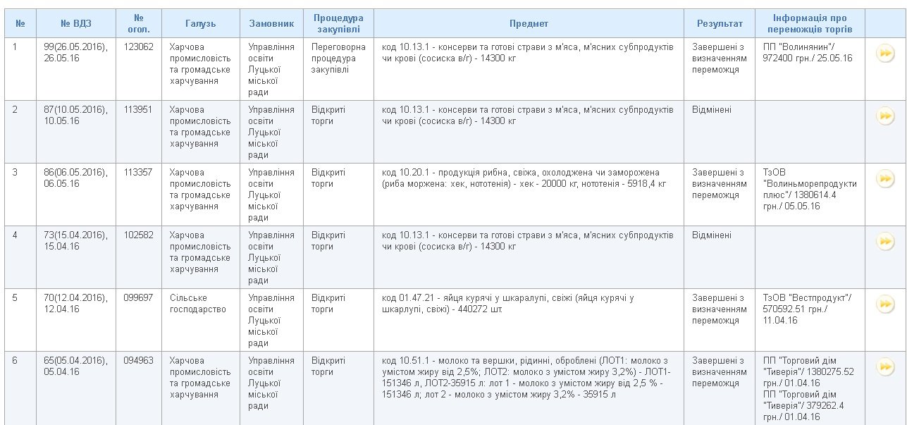 ‒ цукор – 16,02 грн. за кг., (постачальник ‒ ТзОВ «Вестпродукт», Луцьк);
