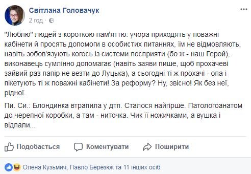 З часом до активістів на розмову прибув голова ГУ НП у Волинській області Петро Шпига та очільник Волинської ОДА Володимир Гунчик. А на ранок, після того як активісти поспілкувались з керівництвом та розійшлися, Світлана Головачук залишила дивне за змістом повідомлення в соцмережі. Публікуємо його без змін:Чи збігається позиція голови ОДА Володимира Гунчика з позицією чиновниці, яка виконує функції його прес-секретаря - невідомо. Адже окрім спілкування з активістами вчора ввечері, офіційних заяв з приводу пікету очільник ОДА поки не робив.
