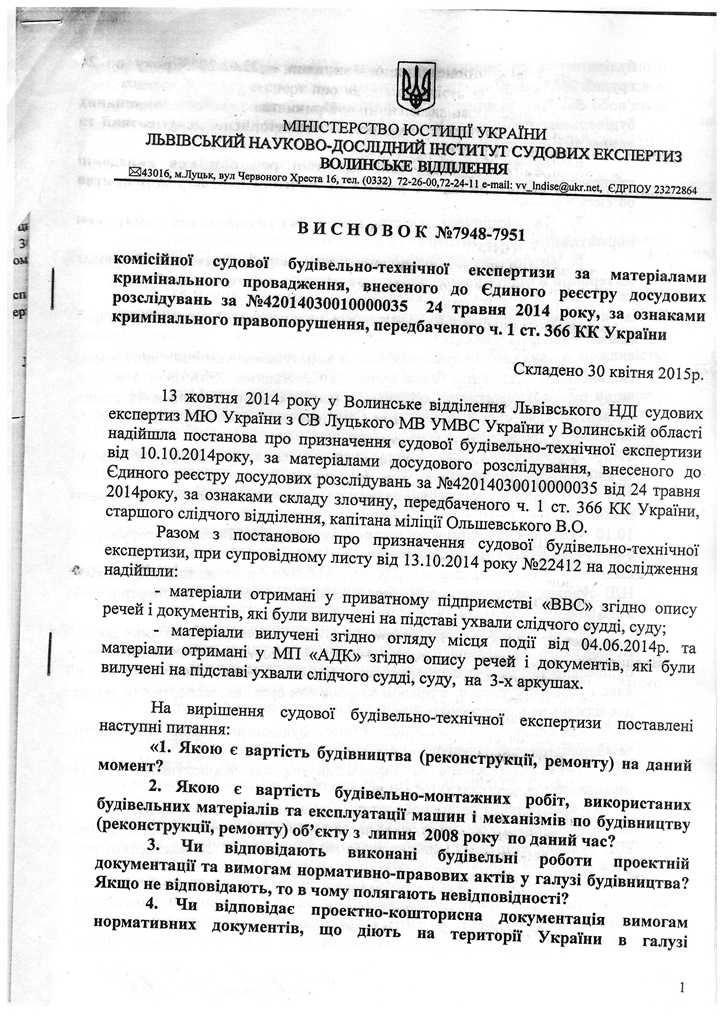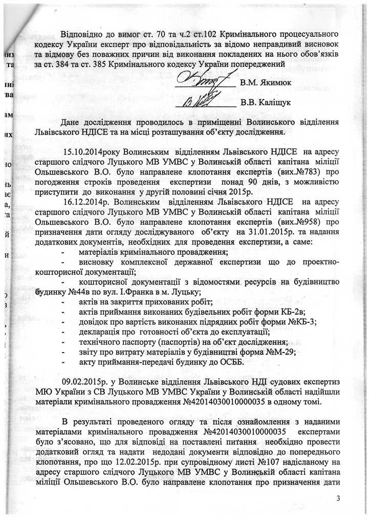 «Посадові особи органів досудового розслідування та процесуального керівництва проігнорували висновок судової будівельно-технічної експертизи, у якому чітко встановлені факти невідповідності збудованого будинку його проекту та вимогам ДБН, (зокрема про це йдеться у відповіді на третє питання слідчого і міститься на 7-9 сторінках висновку експерта). При цьому відповіді на ключові для слідства питання експерти не надали у зв’язку з ненаданням з розпорядження останніх необхідних матеріалів з боку органів досудового розслідування», - йдеться у коментарі заступника.
