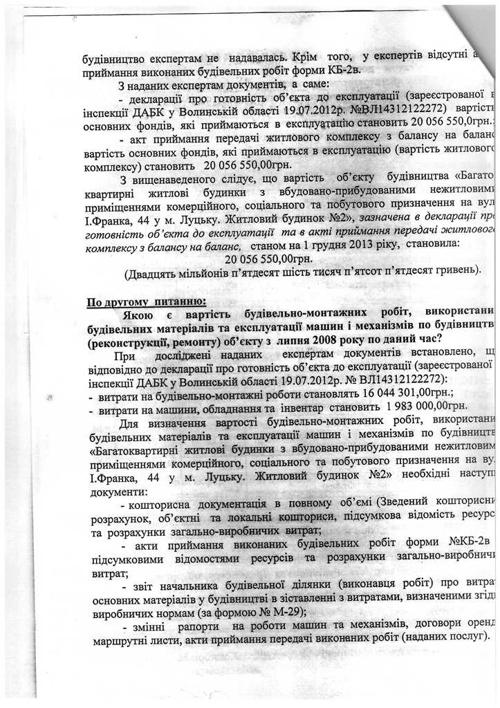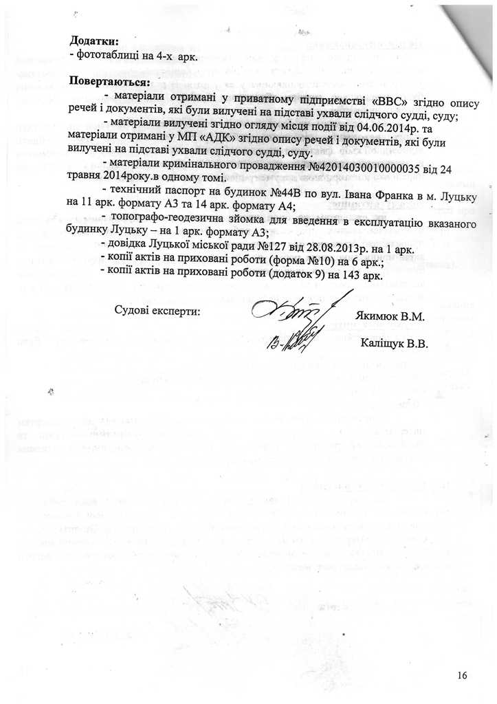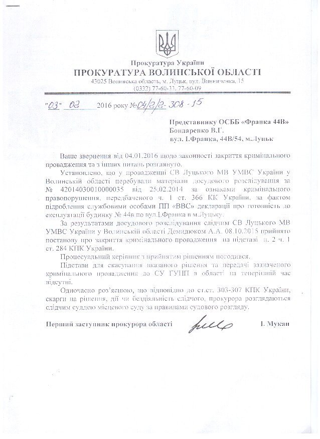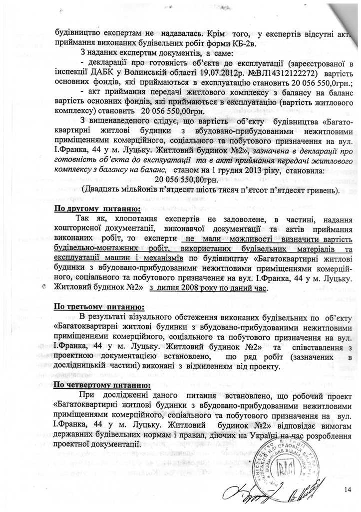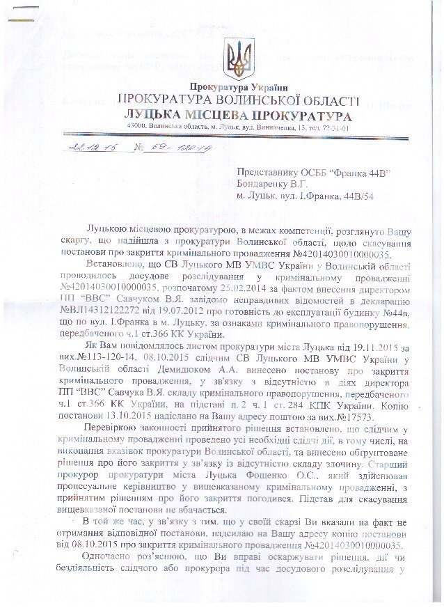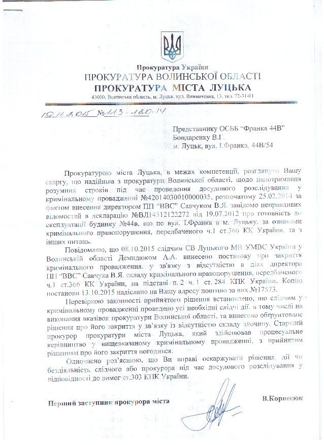 Окрім звернення до Держархбудінспекції, 2 роки тому правоохоронці розпочали досудове розслідування за статтею 366 КК України за фактом службового підроблення при внесені завідомо неправдивих даних до декларації про готовність об’єкта (будинку №44В, що yf вул. І.Франка в м. Луцьку) до експлуатації, яка зареєстрована 19.07.2012 за №ВЛ14312122272 в Інспекції ДАБ у Волинській області.