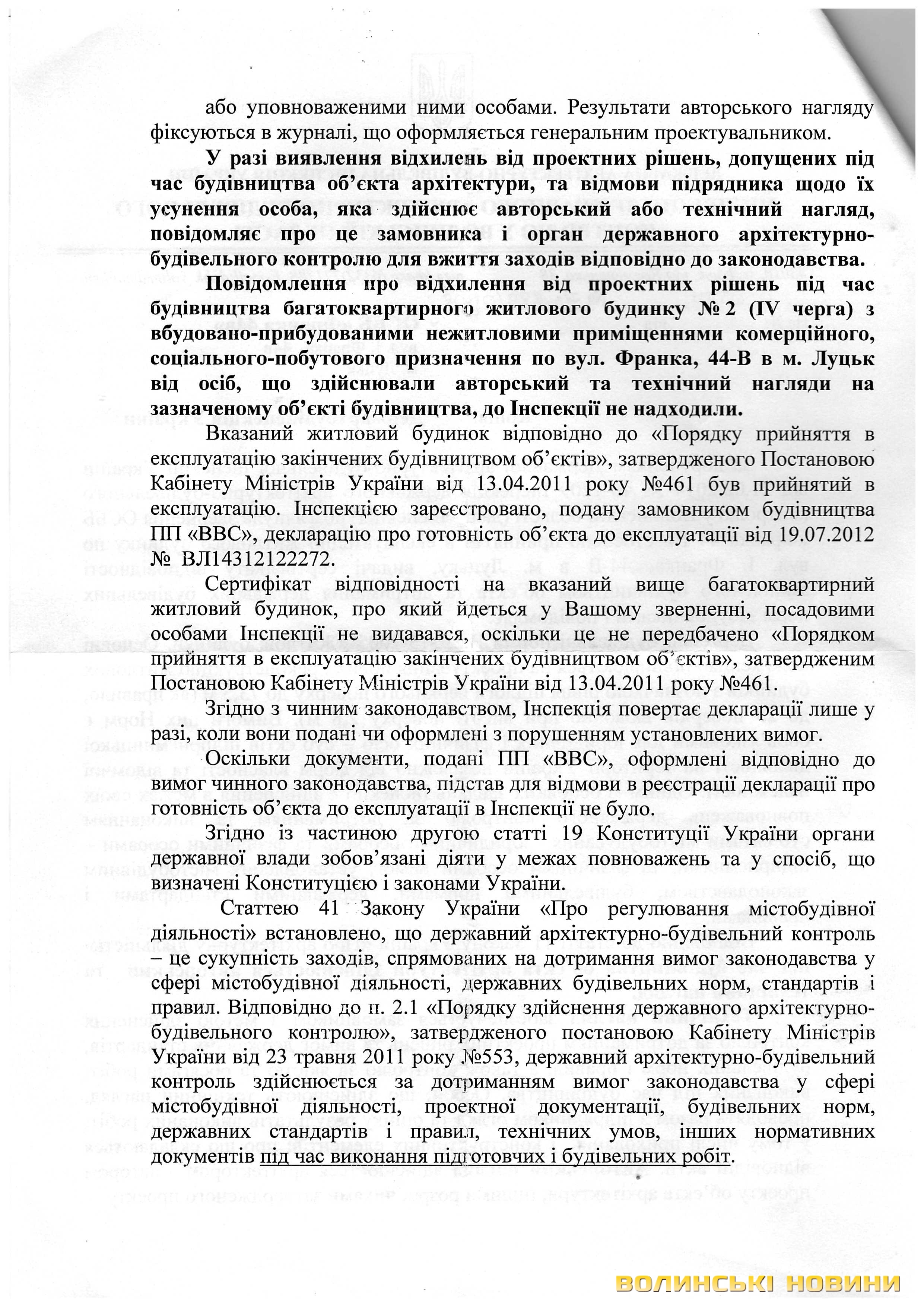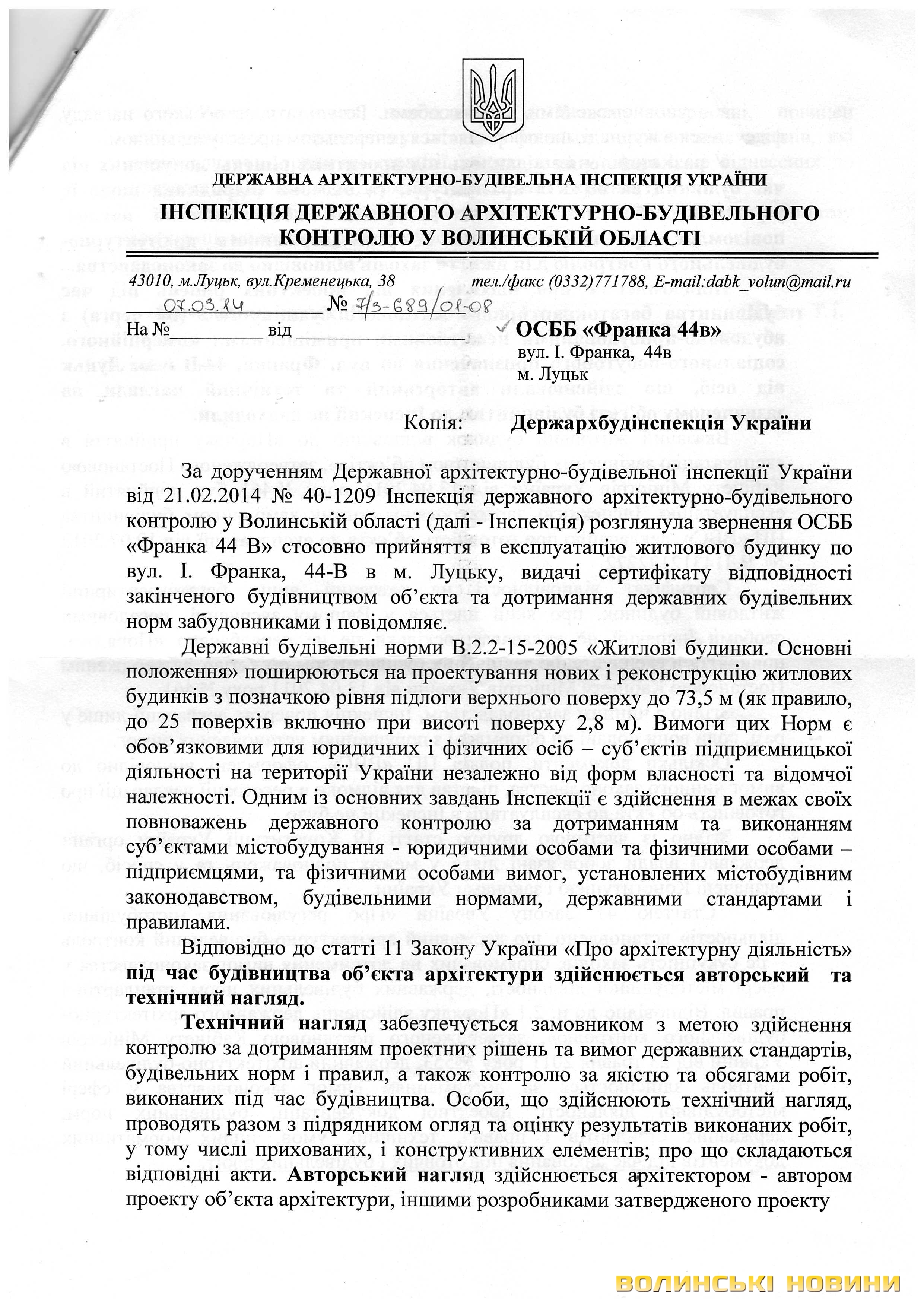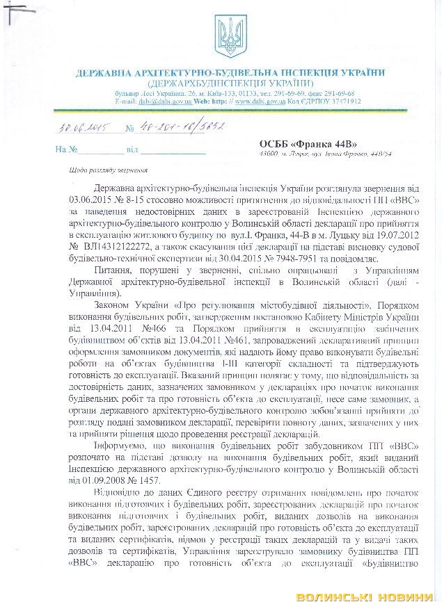 Відповіді з цього приводу ДАБІ у Волинській області та ДАБІ України подаємо у копіях документів: