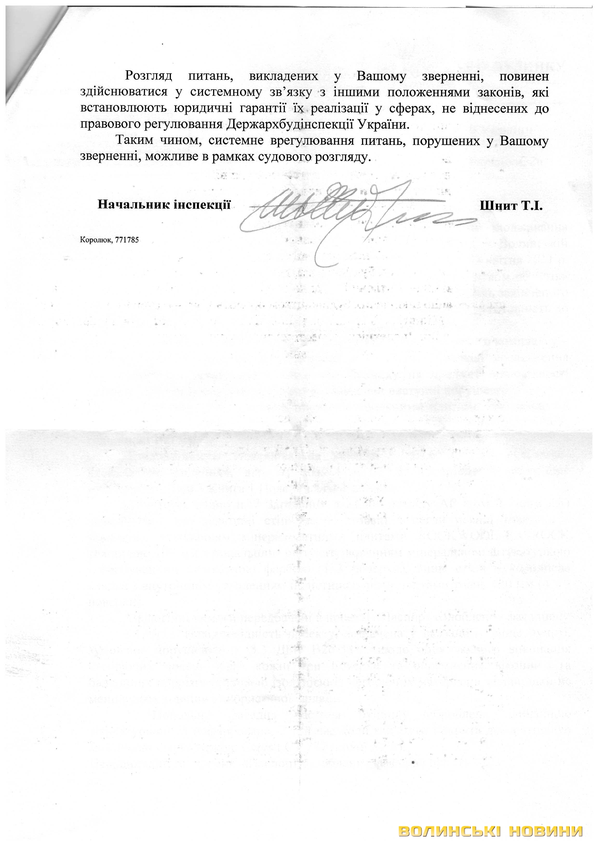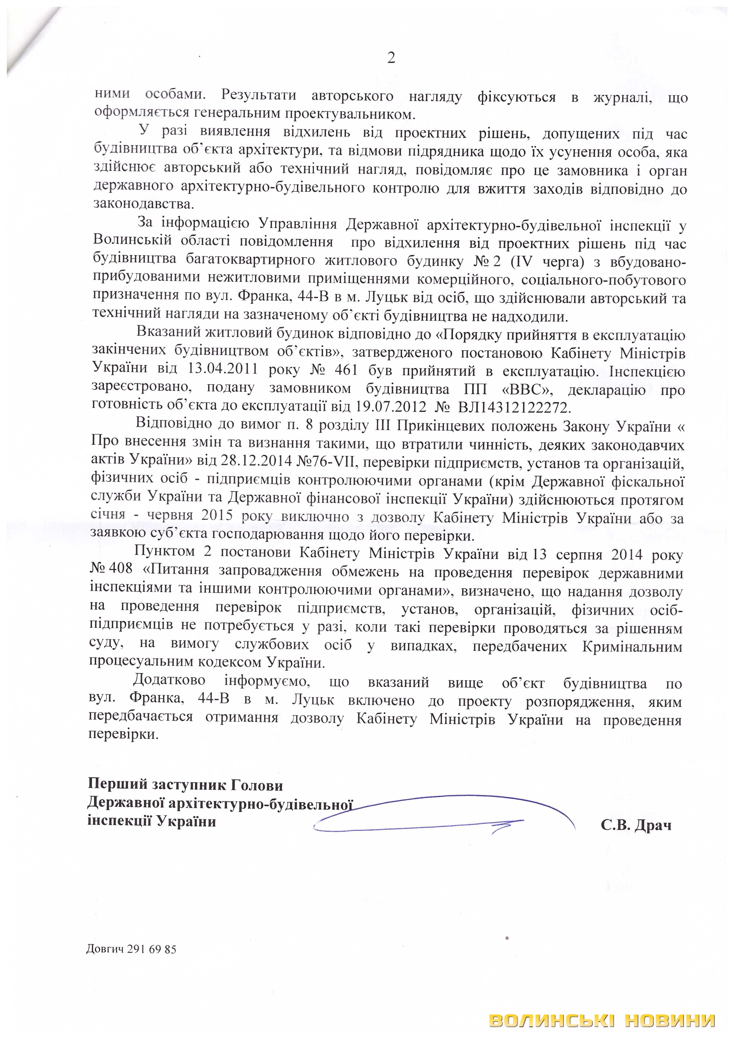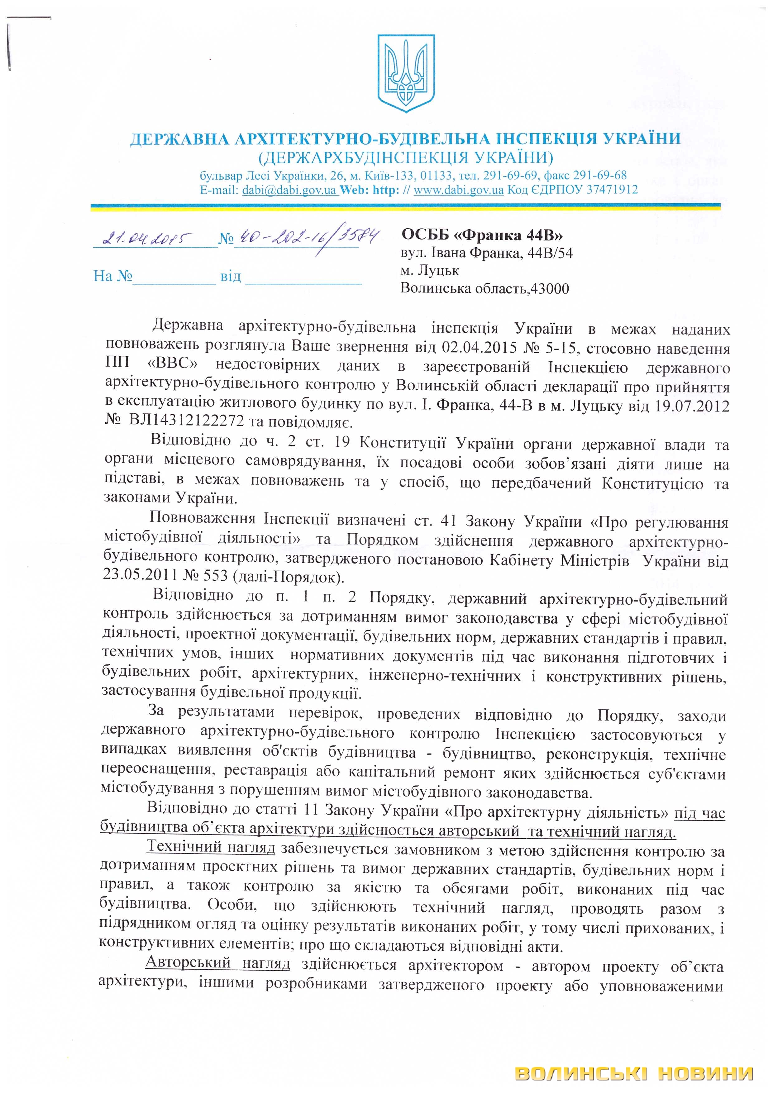 Відповіді з цього приводу ДАБІ у Волинській області та ДАБІ України подаємо у копіях документів: