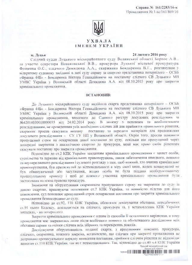 ОСББ подало скаргу слідчому судді на вищевказану погоджену усіма правоохоронцями постанову про закриття кримінального провадження.