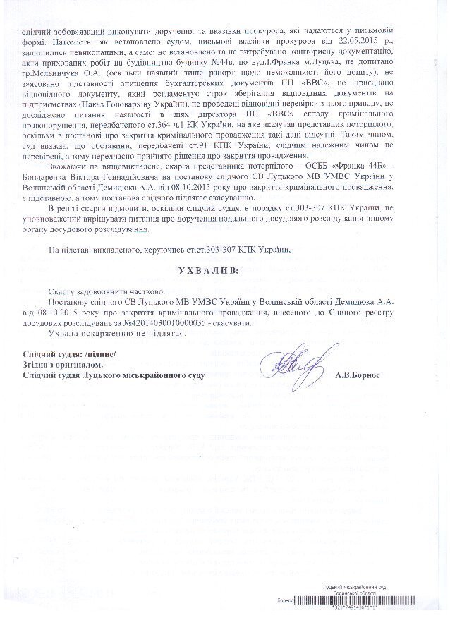 На переконання представника ОСББ, суддя Борнос А.В. ретельно підійшла до розгляду вказаної скарги, дослідила її матеріали, встановила, що слідчим не виконано раніше надані прокуратурою області вказівки, не встановлено та не витребувано кошторисну документацію та акти прихованих робіт на будівництво, не з’ясовано підставності знищення бухгалтерських документів ПП «ВВС», не досліджено питання наявності в діях директора ПП «ВВС» складу кримінального правопорушення, передбаченого ч. 1 ст. 364 КК України, та скасувала вищевказану постанову слідчого про закриття кримінального провадження.