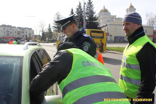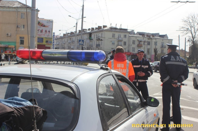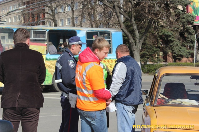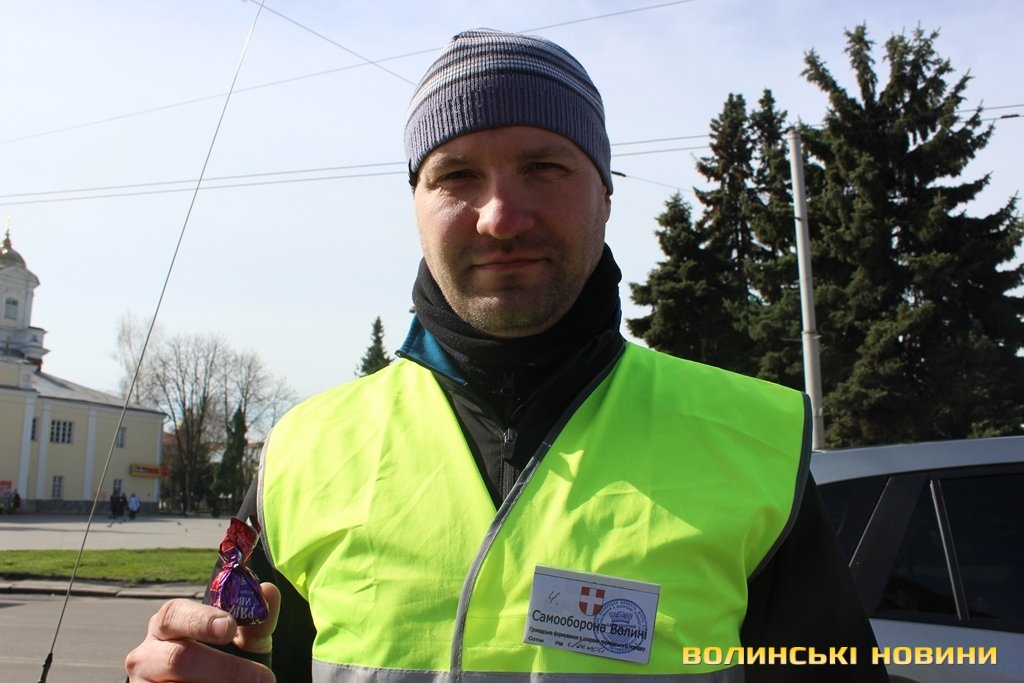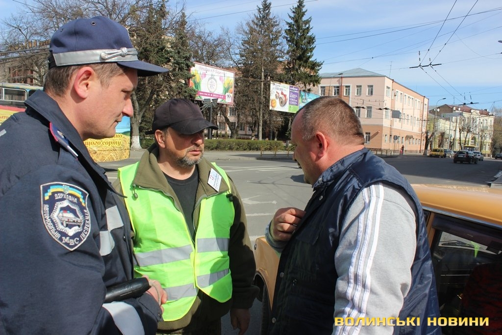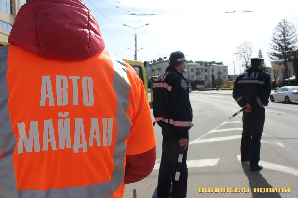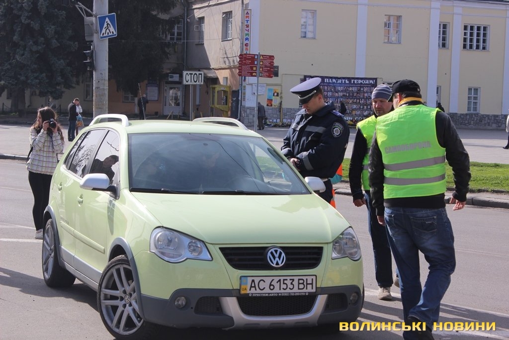 У центрі Луцька масово зупиняють водіїв. Біля центрального універмагу Автомайдан, Волинська Самооборона Майдану спільно із луцькими державтоінспекторами контролюють водіїв щодо дотримання правил дорожнього руху й роздають цукерки.