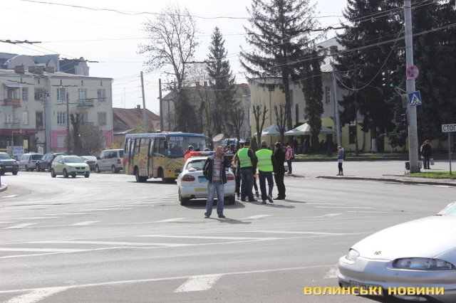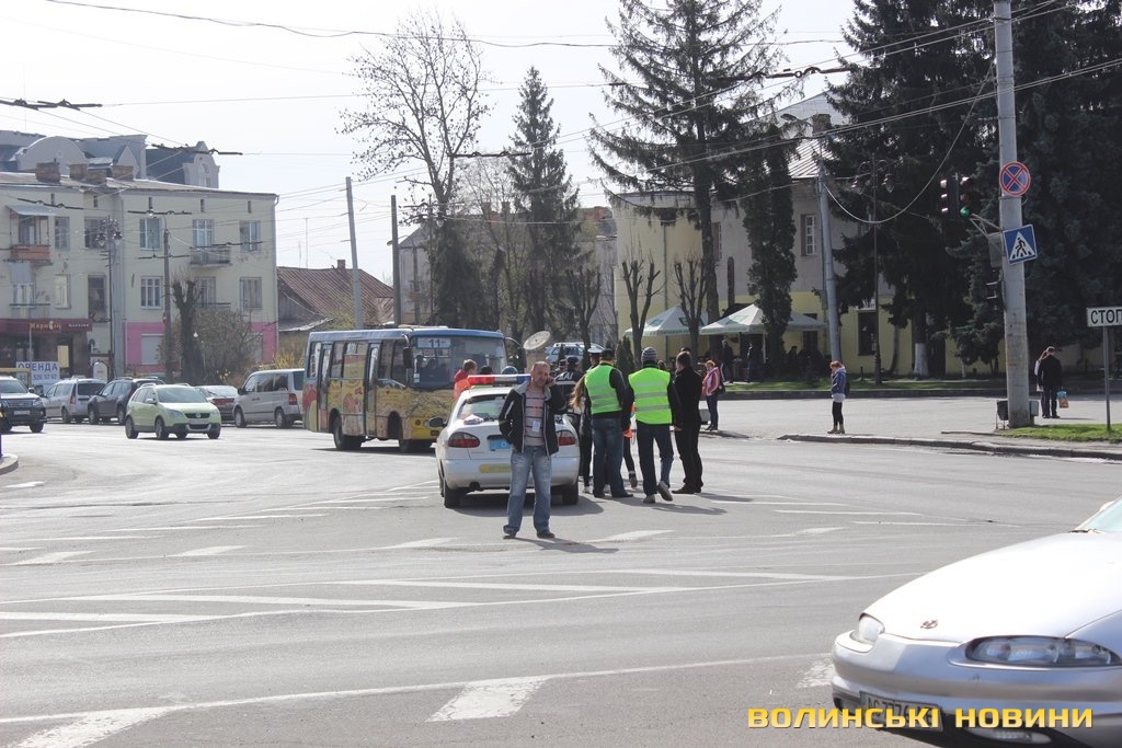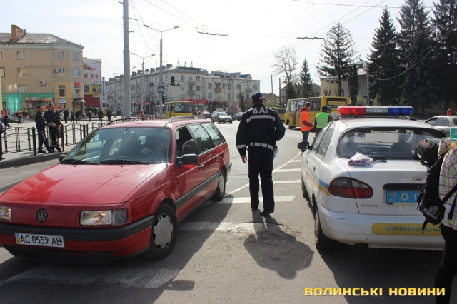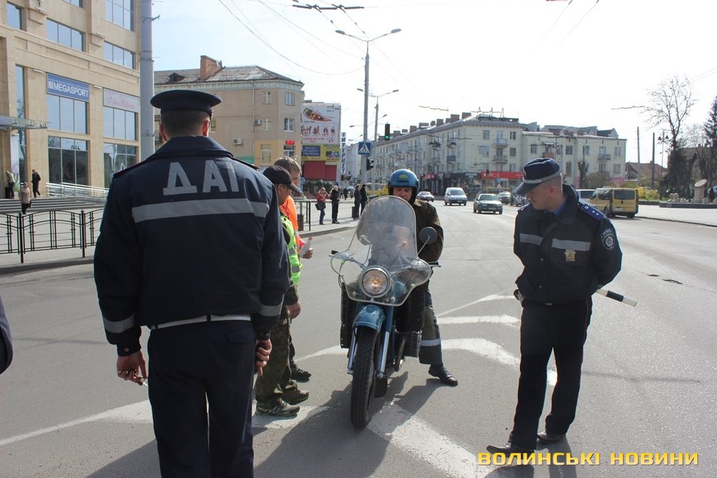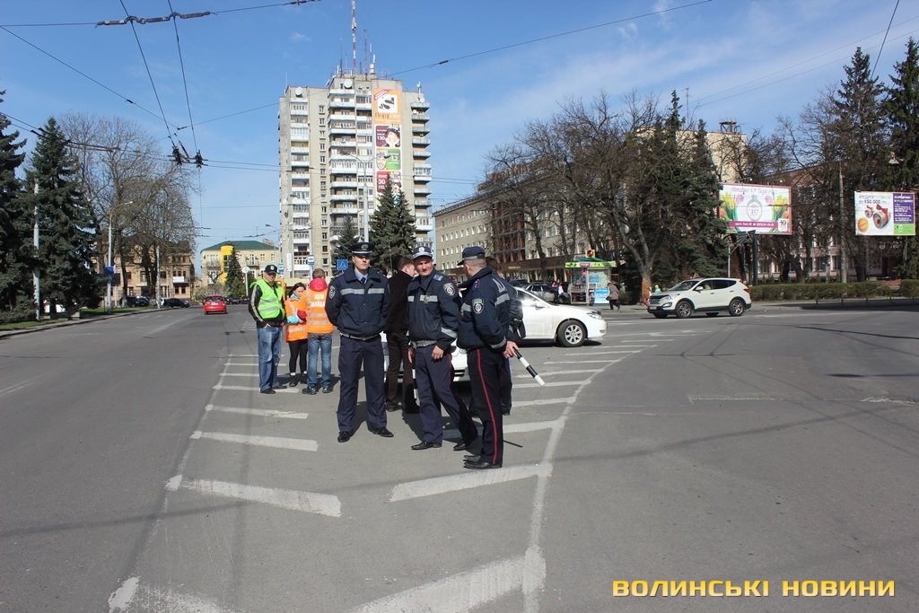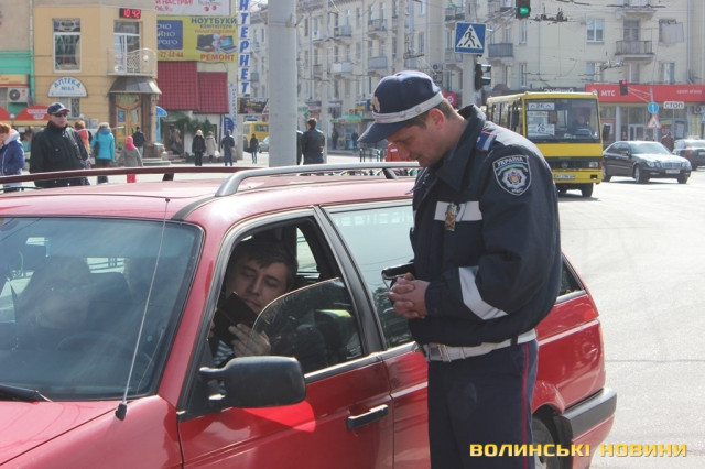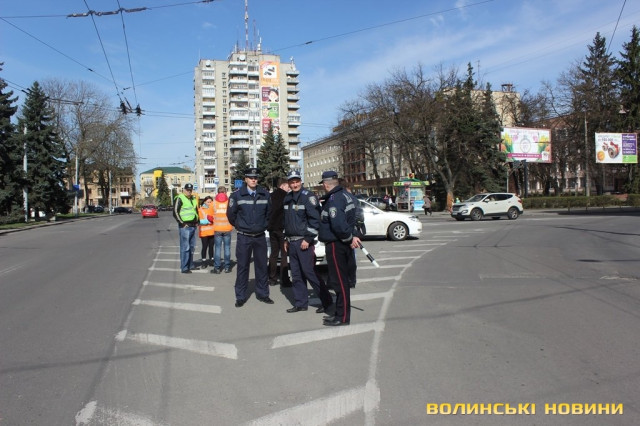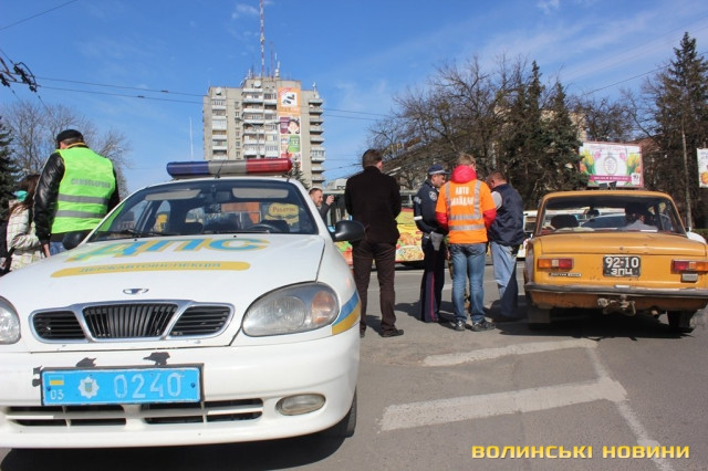 У центрі Луцька масово зупиняють водіїв. Біля центрального універмагу Автомайдан, Волинська Самооборона Майдану спільно із луцькими державтоінспекторами контролюють водіїв щодо дотримання правил дорожнього руху й роздають цукерки.