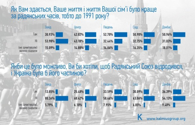 У цілому, що життя у радянський період було кращим, вважають трохи більше 50% опитаних на Донбасі, Сході та Півдні України.