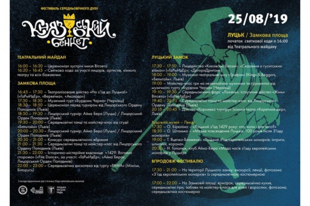 Лекція «3D-анімація та візуалізація» в Молодіжному центрі Волині | 22 серпняLa Piano. Вечір ліричної музики в клубі «Цитра» | 23 серпняВиставка «Сучасний український символізм» у Музеї сучасного українського мистецтва Корсаків | 23–24 серпняСвяткування Дня Незалежності в центральному парку | 24 серпняЛітературна спадщина Луцька. Поетичні читання в книгарні «Є» | 24 серпняIn Rock. День Незалежності в «Майдані» | 24 серпняПам’ятний пробіг «Шаную воїнів, біжу за Героїв України» від Театрального майдану | 25 серпня«Фестиваль професій» у ПортCity | 25 серпняGryphon від Kings & Beggars на Князівському бенкеті в замку Любарта | 25 серпняКнязівський бенкет на Замковій площі | 25 серпняНазад у минуле: Резуc Блюз '1995 у клубі «Цитра» | 25 серпняСебастіян Ешнелік: «Автостопом з Аргентини до північного сяйва» у книгарні «Є» | 27 серпняVinylParty 4u у клубі «Цитра» | 27 серпня