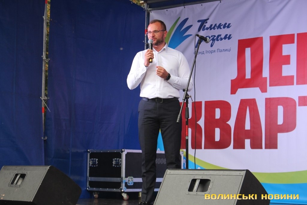 «Мені приємно бути тут присутнім, і я радий разом з вами святкувати. Першою чергою дякую Фонду Ігоря Палиці за організацію такого прекрасного свята. Є День міста, а тепер буде День кварталу. Дякую Фонду не тільки за це свято, а й за всю роботу, за всі ті добрі справи, які зробили впродовж шести років. І я з впевненістю можу сказати, що наше місто не було б таким, яким є зараз, без сил і без того добра, яке вкладає в це місто Ігор Петрович Палиця, без тих справ, які робить команда Фонду, тому щиро дякую. Всіх присутніх вітаю зі святом та бажаю миру, добра й процвітання нашому місту», - висловився Ігор Поліщук.Погода була трохи вередлива й час від часу накрапав дощ, втім, свято продовжувалося й працівники Фонду роздавали дощовики.Перший заступник голови правління Фонду Ігоря Палиці «Тільки разом» Лариса Тарасюк зауважила, що успіху в роботі Фонд досягає завдяки підтримці та зацікавленості волинян у його роботі та відзначила подяками найактивніших лучан.