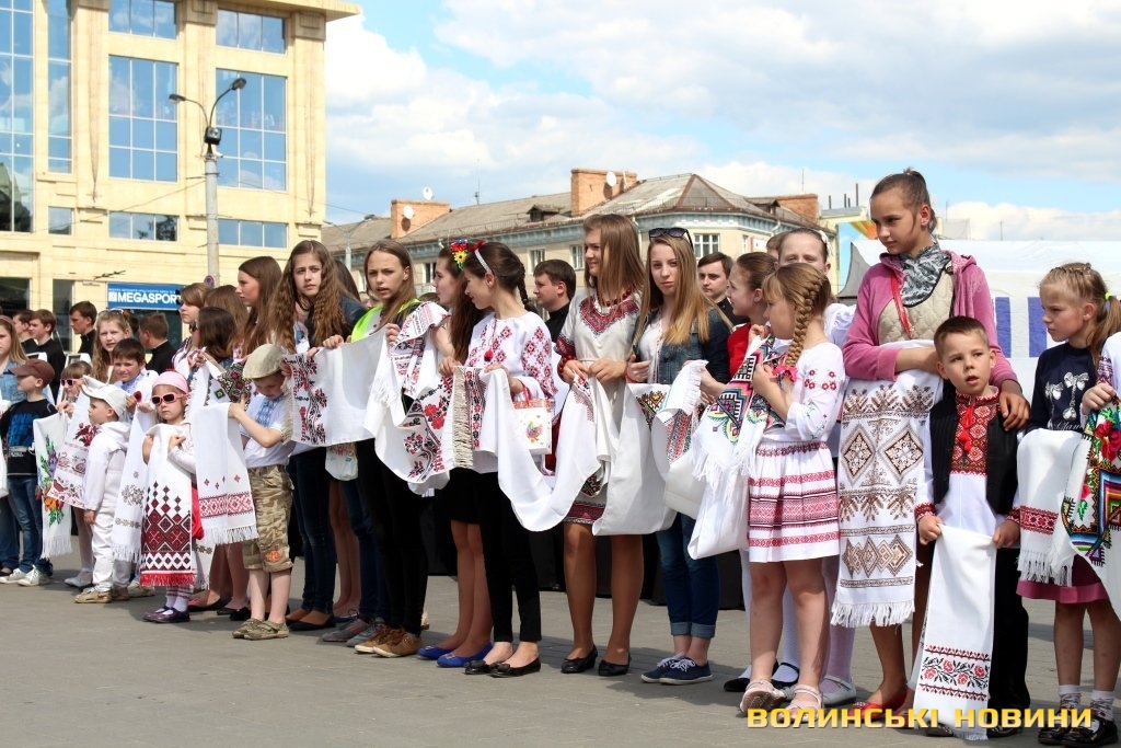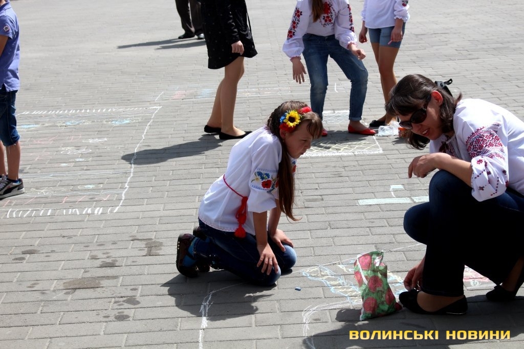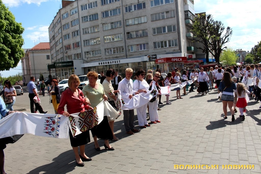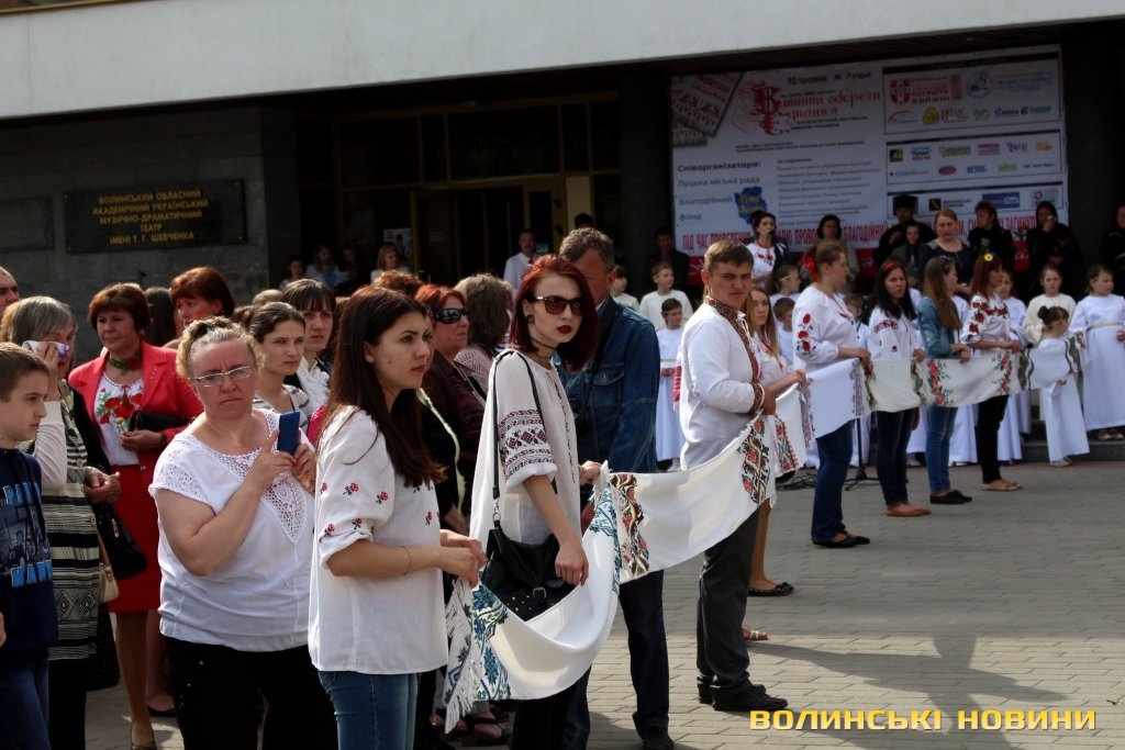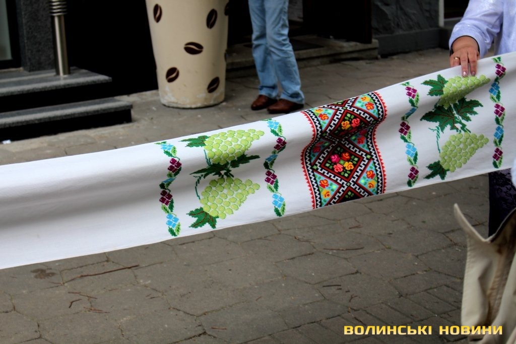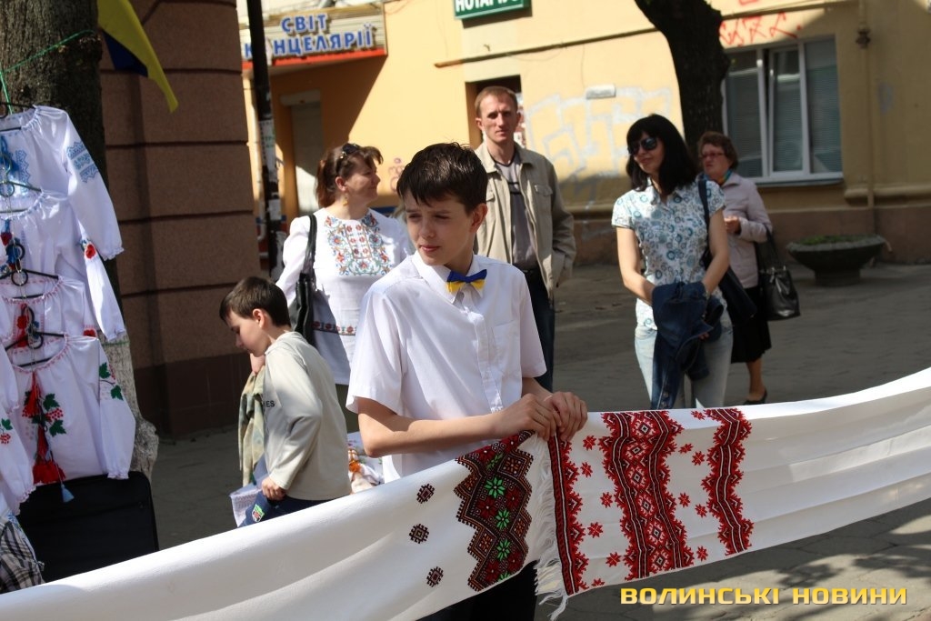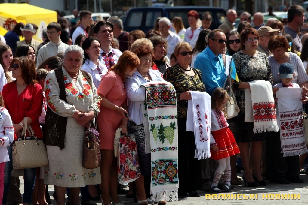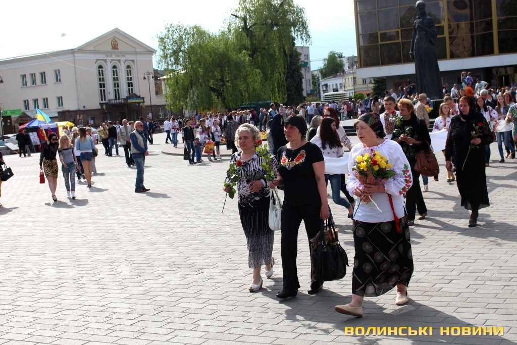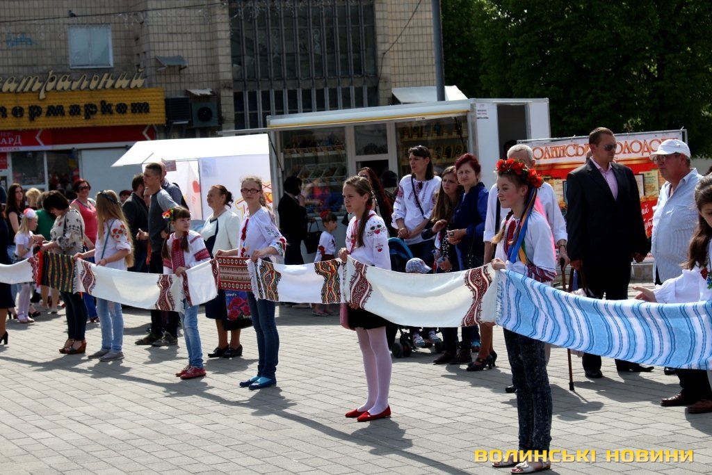 На залитому сонячним світлом Театральному майдані у Луцьку 10 травня зібралося чимало лучан, які прийшли, аби відзначити День матері. Приходили цілими родинами, адже розваг для малечі не бракувало: перед будівлею облмуздрамтеатру пропонували взяти участь у конкурсі малюнку на асфальті (під гаслом «Малюю рушничок мамі»), поряд можна було придбати солодощі, до того ж, відбувався конкурс на кращі весільні короваї. Традиційно відбувся аукціон вишитих рушників.Увесь центр міста ряснів лучанами у вишиванках та із вишитими рушниками – у рамках фестивалю «Вишиті обереги єднання» лучани цього разу утворили спільний вишитий рушник, що простягнувся на сотні метрів Театральним майданом та вулицею Лесі Українки.