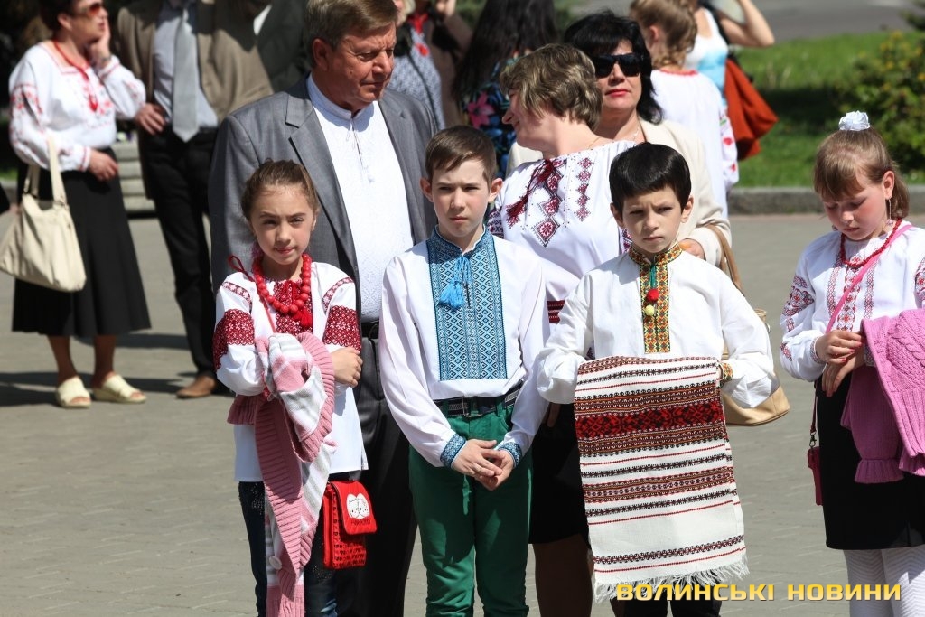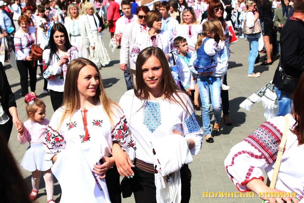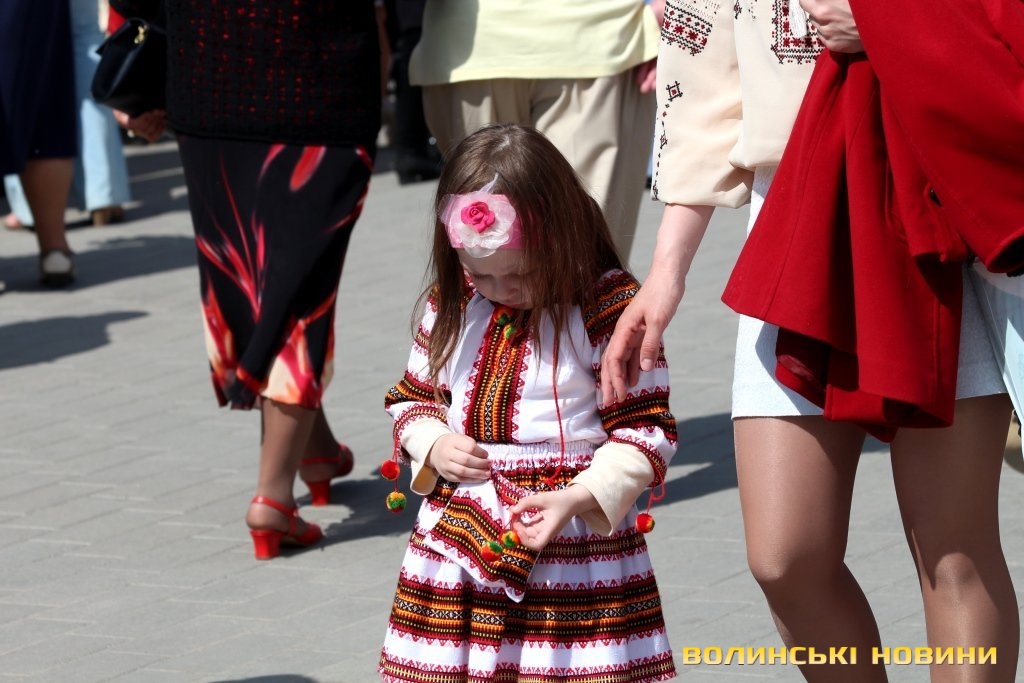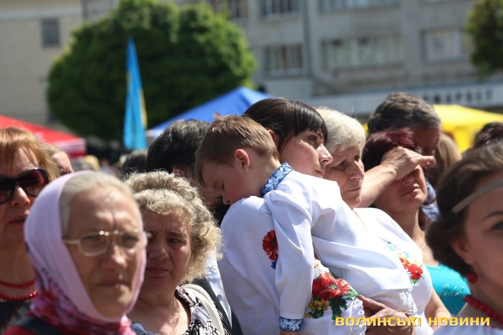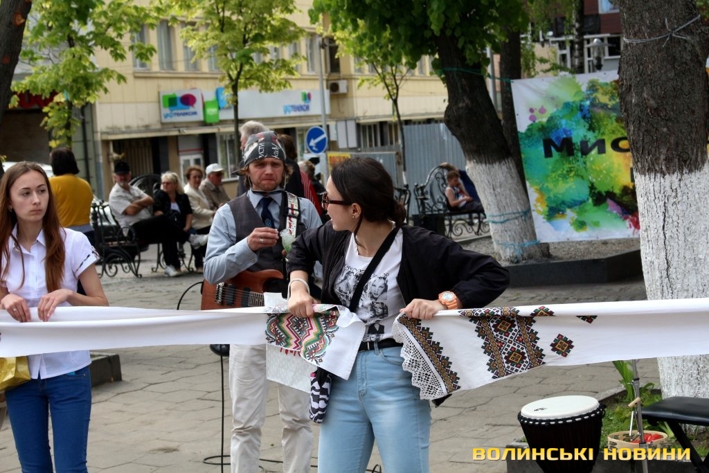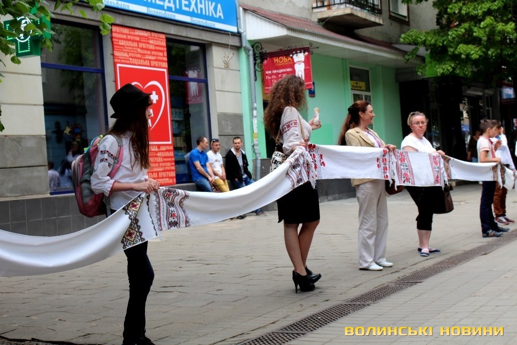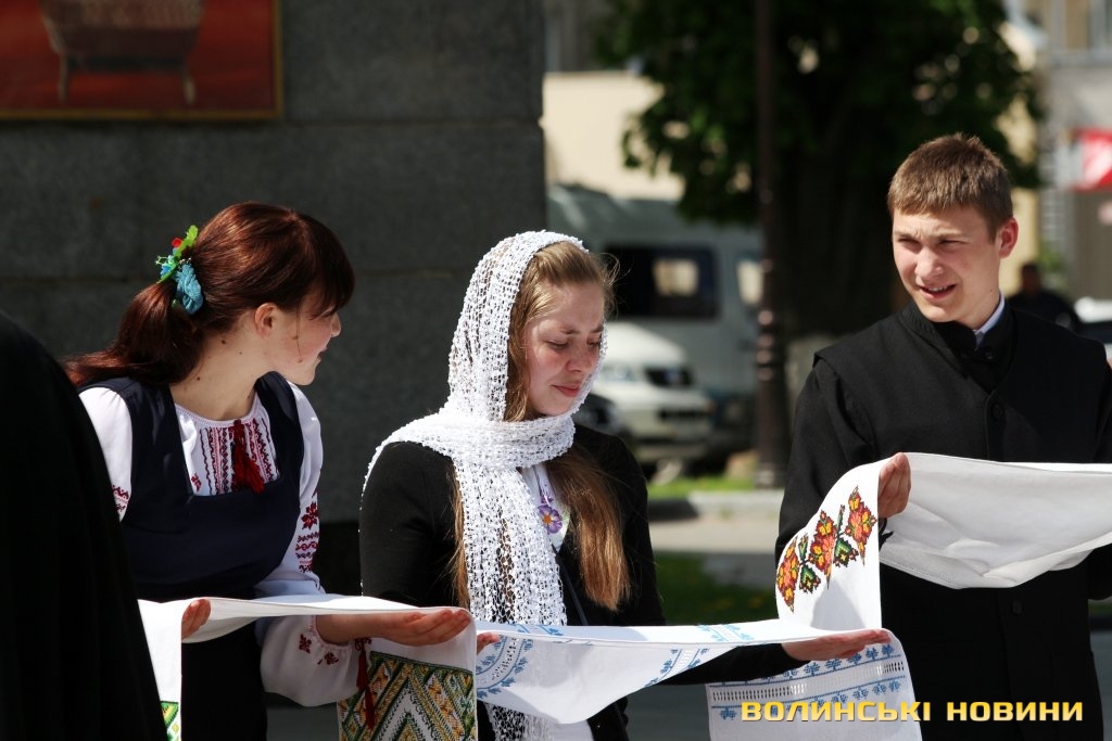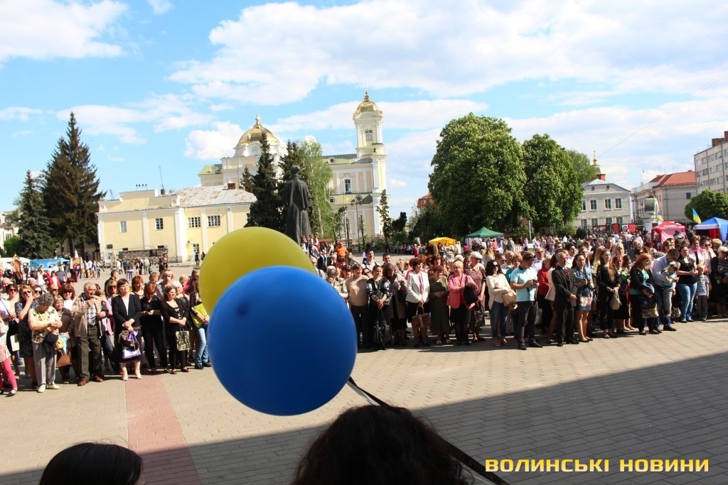 На залитому сонячним світлом Театральному майдані у Луцьку 10 травня зібралося чимало лучан, які прийшли, аби відзначити День матері. Приходили цілими родинами, адже розваг для малечі не бракувало: перед будівлею облмуздрамтеатру пропонували взяти участь у конкурсі малюнку на асфальті (під гаслом «Малюю рушничок мамі»), поряд можна було придбати солодощі, до того ж, відбувався конкурс на кращі весільні короваї. Традиційно відбувся аукціон вишитих рушників.Увесь центр міста ряснів лучанами у вишиванках та із вишитими рушниками – у рамках фестивалю «Вишиті обереги єднання» лучани цього разу утворили спільний вишитий рушник, що простягнувся на сотні метрів Театральним майданом та вулицею Лесі Українки.