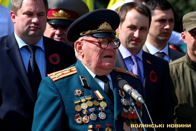 «Цей день потрібно зустрічати з великим трепетом, добрим серцем і добрими надіями. Війна, яка прокотилась всією Україною своїм всезнищуючим катком, принесла разом із собою велику розруху, сльози та смерть українцям. Але, виходячи з цього, український народ піднявся для боротьби з фашистами. І сьогодні ветерани сподіваються, що молоде покоління буде гордо нести попережу себе синьо-жовтий прапор. Я пройшов більше, ніж 2 тисячі кілометрів рідною українською землею. Я сподіваюся, що ми, ті, хто ще залишився живими з тієї війни, виконаємо ті заповіти, що залишили їх вам полеглі під час війни. Я славлю тих людей, які обороняли і захищали Україну від ворогів, які й сьогодні хочуть захопити шматок України. Слава Україні», - звернувся до присутніх учасник бойових дій Другої світової війни Ігор Мисенко.Після його промови, слово надали ветерану Братства ОУН-УПА, громадській діячці та письменниці Тетяні Барбелюк. Зі сльозами на очах вона звернулася до українських воїнів, бійців, які захищають державний суверенітет на сході: