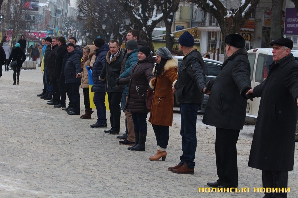 «Першочергово вшановуємо пам’ять тих Героїв, які два роки тому поклали своє життя за незалежність нашої держави. Ми називаємо це Революцією Гідності. Але, мимоволі дивлячись на цей стенд, ми можем назвати трьох чоловік – це Юрій Вербицький, Михайло Жизневський, Сергій Нігоян, – які два роки тому загинули на Майдані за наш з вами вибір, за наше з вами майбутнє. Вони загинули в мирний час, але з великою любов’ю до своєї держави і великим бажанням бачити майбутнє своє і своїх рідних щасливим. До самопожертви не кожна людина готова. Але є постаті, на які ми рівняємось через віки. Сьогодні ми згадаємо і тих, хто на початку 20 століття свої особисті побажання і амбіції відставив в сторону і сказав: «Україна понад усе!» й «Борітесь та поборете». І ми це називаємо Днем Соборності, або Днем Злуки, бо Україна – понад усе, і нині, і на початку 20-го століття. Ці люди, яких ми сьогодні згадуємо, вийшли на Майдан, повторюючи гасло своїх прадідів. Ми згадуємо про них, тому що і самі вважаємо Україну своєю Батьківщиною, незалежною державою. Кожен із нас – індивідум, але є речі і цінності, що об’єднують нас: наша земля, віра, культура», – звернувся до лучан духівник.Опісля усі присутні на заході лучани, незалежно від віку й соціального статусу, традиційно взялися за руки й об’єднались у «живий ланцюг єдності».