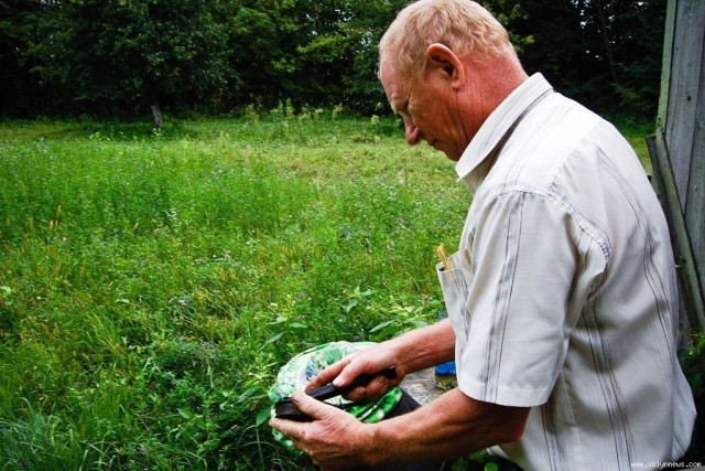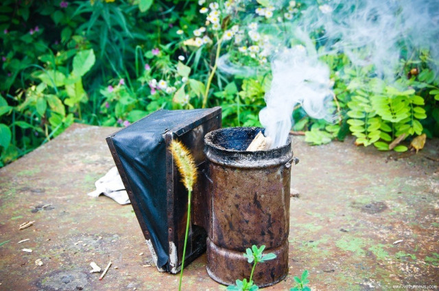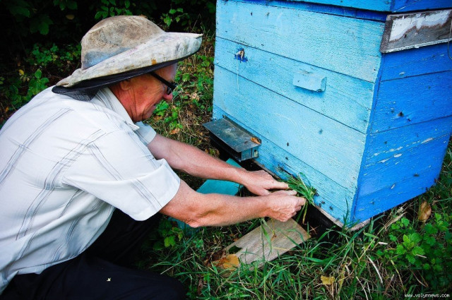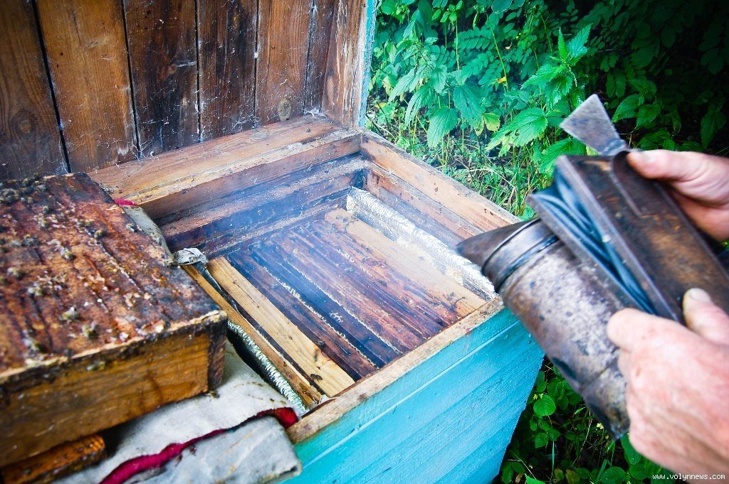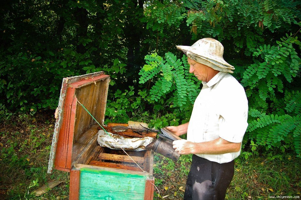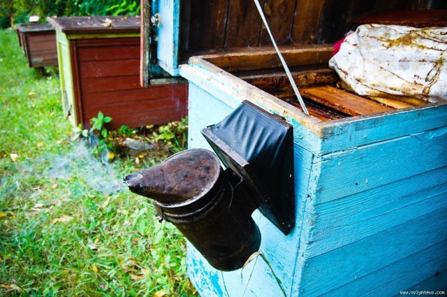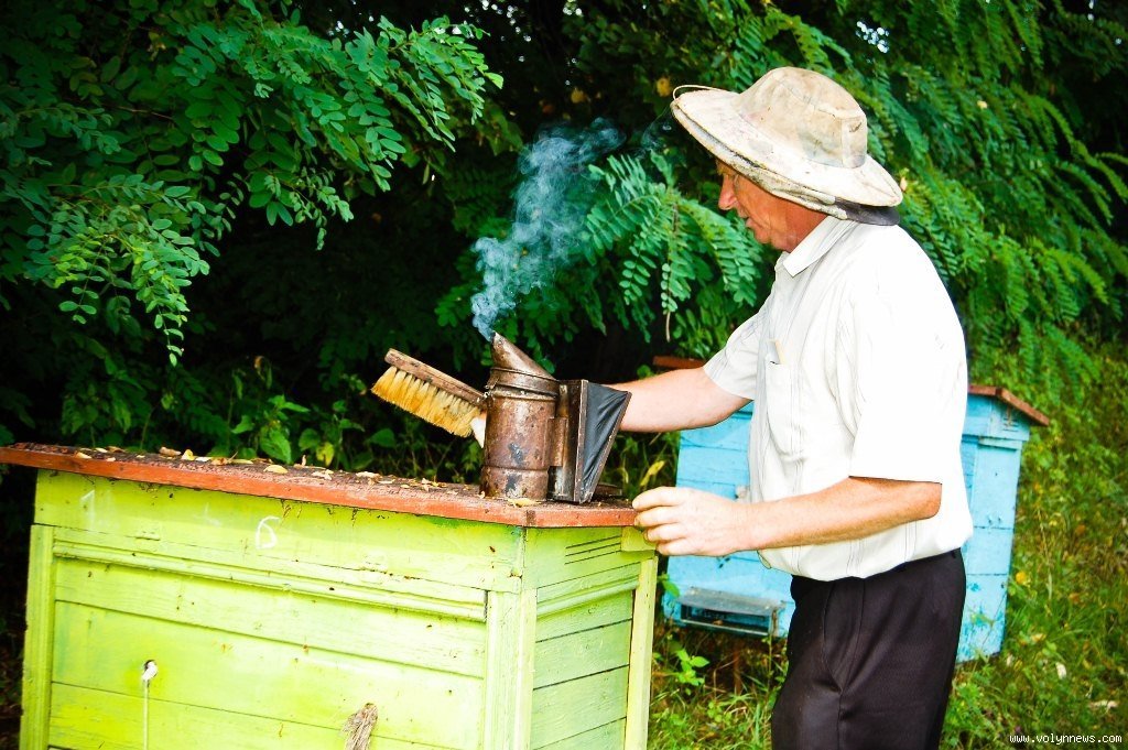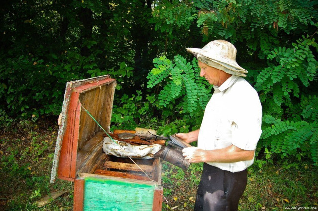 Іван Анастасійович запалює «димаря» і одягає на голову «ситко». «Пасічники довго не можуть розпалити, а я беру свічок остатки і їми добре запалювати», ‒ ділиться секретами матковод.