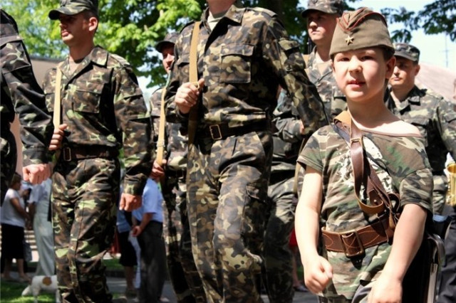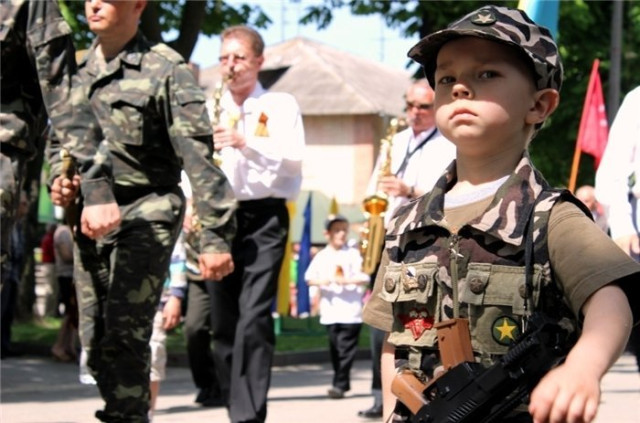Маленький воїн-хлопчик віднісся до параду серйозно!!! ;)Відповідально стоїть.