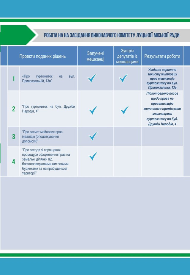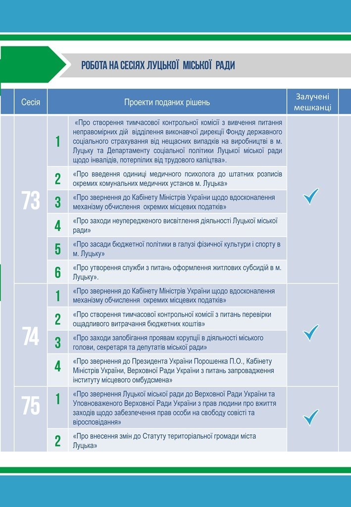 Утім чимало рішень членам депгрупи відстояти таки вдалося. Зокрема, щодо ТРЦ «ПортCity» - це повернення в міський бюджет чотирьох мільйонів, програма, яку депутати ініціювали і провели щодо підтримки учасників АТО та їхніх сімей, також відстояли рішення, аби не знімали доплати працівникам бюджетної сфери у Луцьку. За період роботи вдалося запровадити систему електронних закупівель в діяльність виконавчих органів Луцькради. Окрім того, протидіяли зловживанням на тендерах у комунальних господарствах тощо.