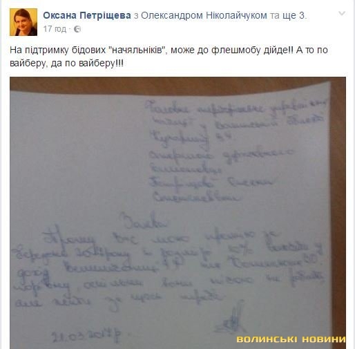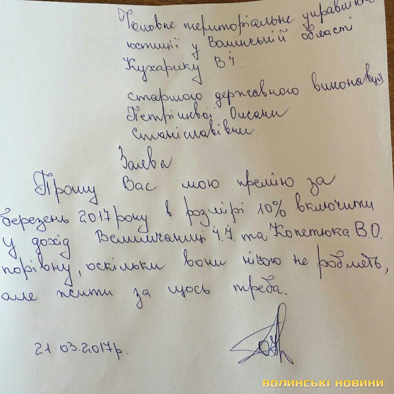 «Прошу Вас мою премію за березень 2017-го року в розмірі 10% включити порівну у дохід Велимчаниці та Копетюку, оскільки вони нічого не роблять, але їсти за щось треба», - написала Оксана Петріщева 21-го березня, а свій пост підписала так: «Набридло мовчати про те, що треба говорити. Ой, ще багато про що можна говорити…але не сьогодні».Працівниця Луцького районного відділу ДВС прокоментувала ситуацію Інформаційному агентству Волинські Новини