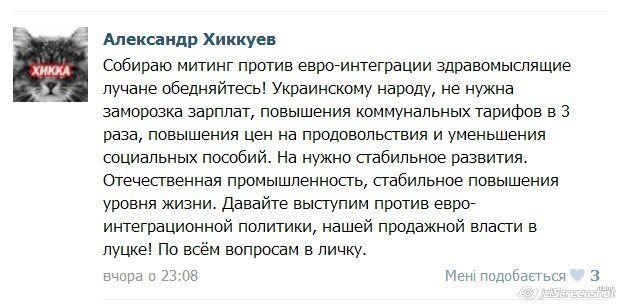 «Собираю митинг против евроинтеграции, здравомыслящие лучане, объедняйтесь! Украинскому народу не нужна заморозка зарплат, повышение коммунальных тарифов в 3 раза, повышение цен на продовольствие и уменьшение социальных пособий. Нам нужно стабильное развитие. Отечественная промышленность, стабильное повышение уровня жизни. Давайте выступим против евроинтеграционной политики, нашей продажной власти в Луцке! По всём вопросам - в личку»