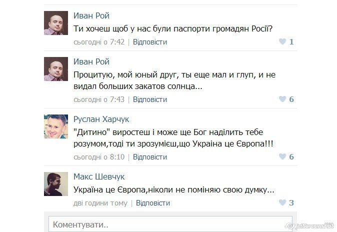 Пропоную цю свиню забанити у ВК. Що я вже й зробив. Від нього ніякого конструктивного заперечення, а лише бруд, заснований на промиванні мізків від Раши. Не варто втягуватись в непотрібну тяганину. Я впевнений, що дитина навіть нічого приблизно й не знає що передбачає Асоціація (це ще далеко не членство в ЄС, зауважте) і мУтний союз.
