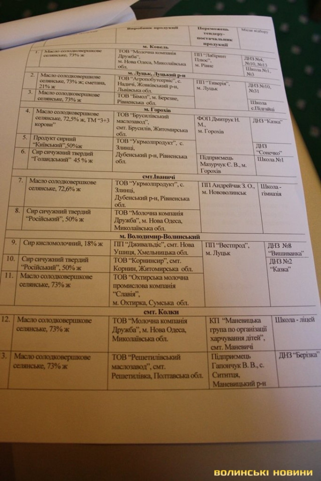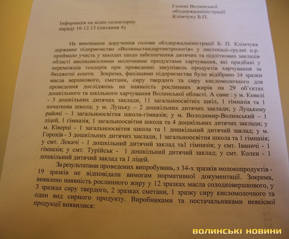 Як з’ясувалося, ДП «Волиньстандартметрологія» відібрало 34 зразки масла, сметани, сиру у волинських школах і садочках. 19 з них не відповідають нормативним документам і містять пальмову олію, тобто вважаються фальсифікатом. Дітей годували навіть забороненим для них сирним продуктом. Більше того, як повідомив генеральний директор ДП «Волиньстандартметрологія» Михайло Жуков, майже усі виробники – не місцеві. Є виробники з Рівненської, Житомирської, Миколаївської та інших областей.