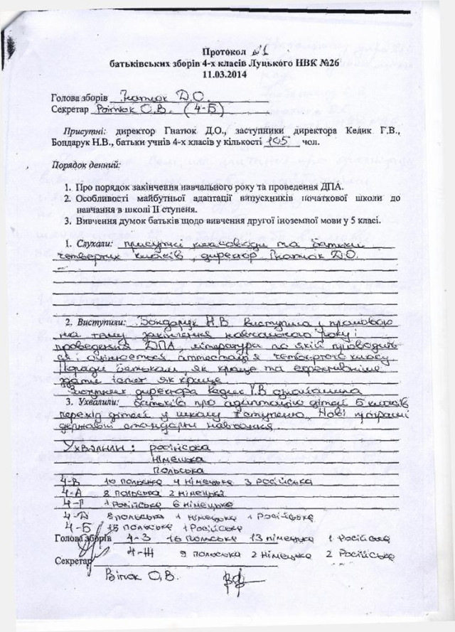Керівник школи спростовував слова батьків і переконував, що вчителі ніякої агітації серед батьків за вибір якоїсь однієї мови не вели. Лічильна комісія, складена з представників від кожного 4-го класу, порахувала результати за зібраними анкетами і оголосила їх по кожному класу. Тож вибір батьків було зареєстровано і оголошена загальна ухвала. Заперечень і зауважень у батьків не було. Протокол батьківських зборів надав для оприлюднення.