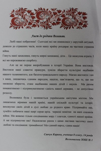 А п’ятикласники Волноваського ліцею написали своїм ровесникам колективного листа, у якому діти висловлюють віру у те, що в Україні буде мир, і вона буде процвітати, як і раніше.