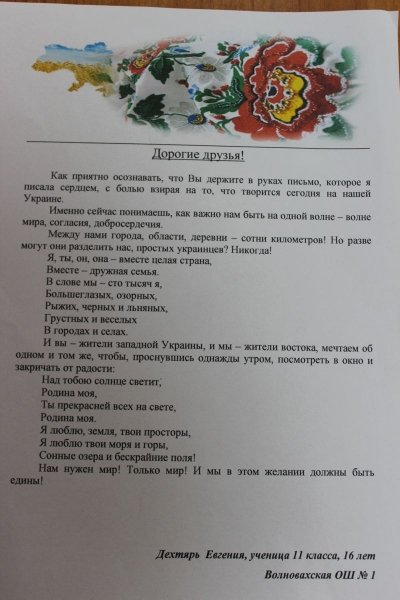 Дев’ятикласниця Волноваської школи №2, яка не вказала свого імені: “ Я живу в Україні вже 15 років. За цей невеликий час я встигла полюбити свою державу, її людей. Ми з батьками багато подорожували по Україні. Були на заході, півночі, півдні. І кожному з її куточків спілкувалися з людьми, що живуть там. Ті люди були дуже схожі на нас своєю мовою, звичаями, манерами. Тоді ми з батьками зрозуміли, що ми любимо український народ і хочемо спілкуватися з своїми друзями зі Львова, Волині”. А Віка Кулик з цієї ж школи написала: “Багато мої однолітків поїхали зі своїми родичами світ за очі. Хтось пішов шукати порятунок в країні агресора, хтось в Україні. Але я сподіваюсь, що мені з батьками не доведеться кидати рідне місто Волноваху.”