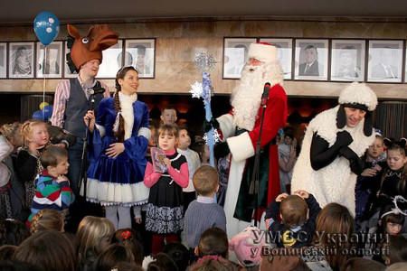 Традиційно вітали діток Дід Мороз та Снігуронька, інші казкові персонажі. А завершилося свято цікавим театралізованим дійством за участю акторів волинського обласного музично-драматичного театру.