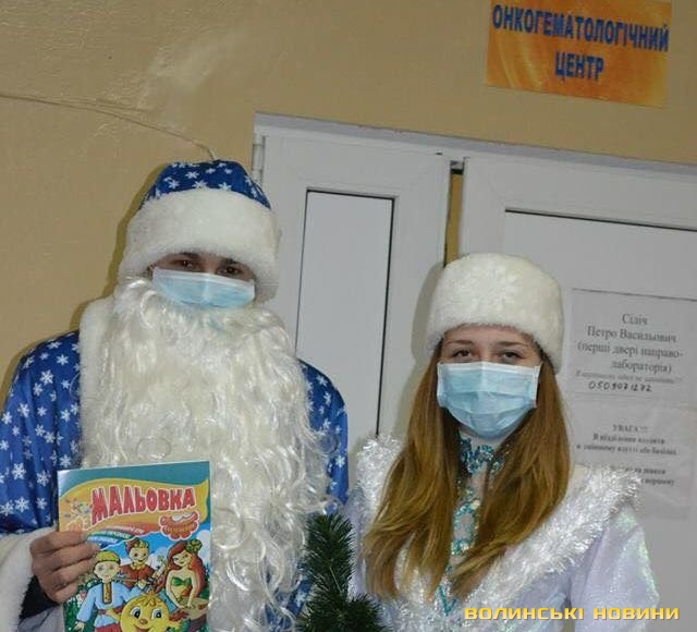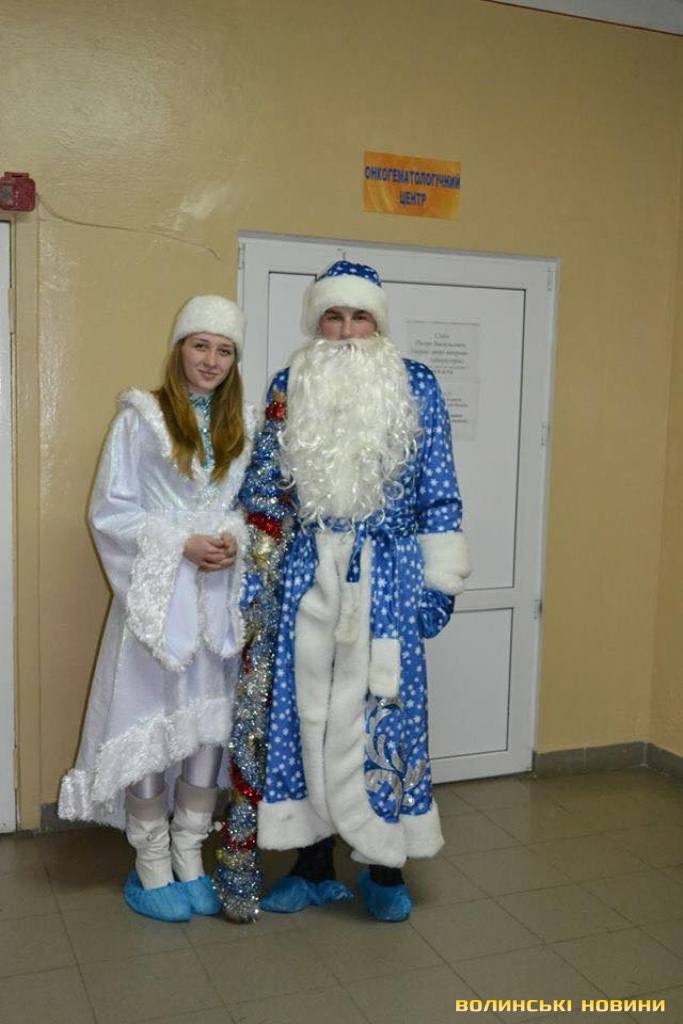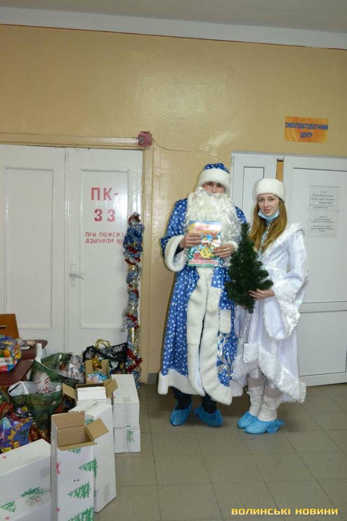 Малечі принесли альбоми та розмальовки. Солодощів та інших новорічних ласощів в мішку Діда Мороза не виявилось, адже хворим потрібно дотримуватись строгої дієти. Проте, зі слів організаторів, це зовсім не засмутило малят, оскільки натомість їм принесли ялинки та маленьких саморобних ангелів, який зробили для них вихованці Палацу учнівської молоді міста Луцька.