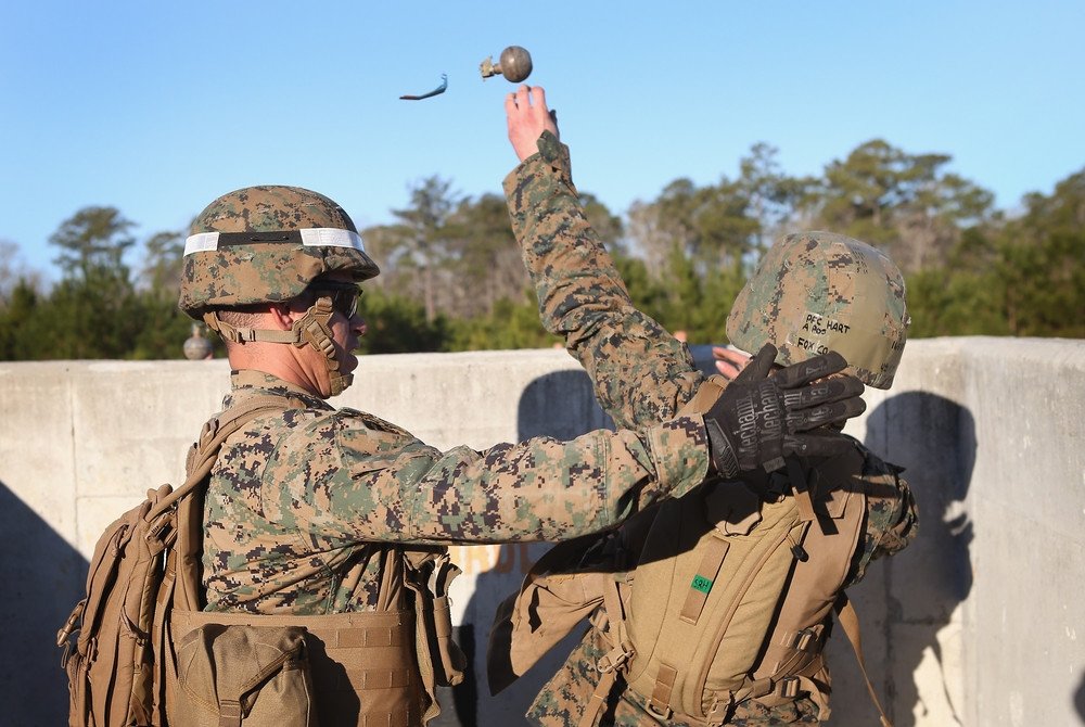 10. Морський піхотинець збирається кинути навчальну гранату під час навчань у рамках курсу морської бойової.