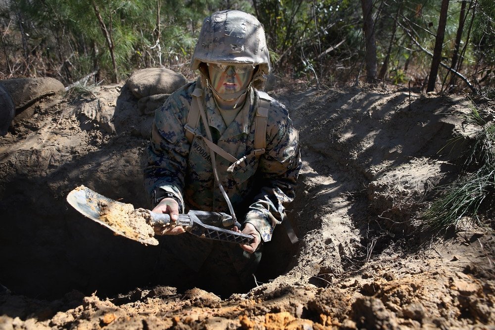 8. Рядовий 1-го класу Шевль Вудард з Гранд Прейрі, штат Техас, риє окопи під час навчань.