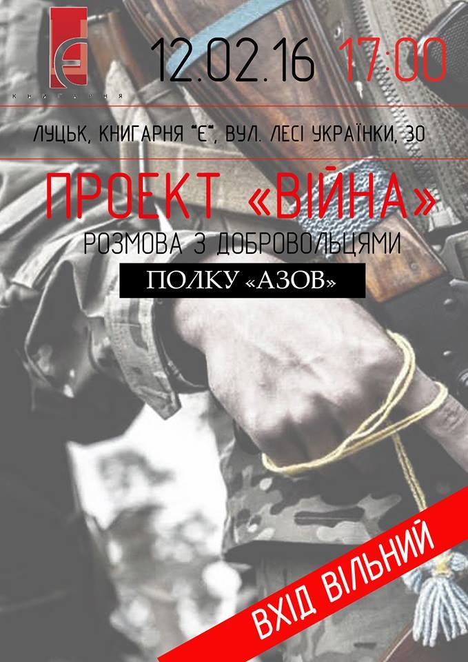 На розмову з добровольцями полку «Азов» у рамках мережевого проекту «Війна» запрошують вже сьогодні, 12 лютого, усіх охочих.