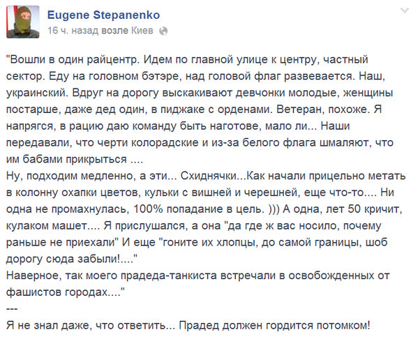 «Увійшли в один райцентр. Йдемо головною вулицею до центру, приватний сектор. Їду на головному БТРі, над головою прапор майорить. Наш, український. Раптом на дорогу вискакують молоді дівчата, жінки старшого віку, навіть дід один, в піджаку з орденами. Ветеран, схоже. Я напружився, у рацію даю команду бути напоготові, мало що... Наші передавали, що чорти колорадські і через білий прапор шмаляють, що їм бабами прикритися. Ну, підходимо повільно, а ці... Східнячки... Як почали прицільно метати в колону оберемки квітів, пакети з вишнями та черешнями, ще щось. Жодна не влучила, 100% попадання в ціль. А одна, років 50, кричить, махає кулаком.... Я прислухався, а вона: "так де ж вас носило, чому раніше не приїхали" І ще додає, "женіть їх хлопці, до самої межі, щоб дорогу сюди забули!...." Напевно, так мого прадіда-танкіста зустрічали у звільнених від фашистів містах."», - написав Степаненко.