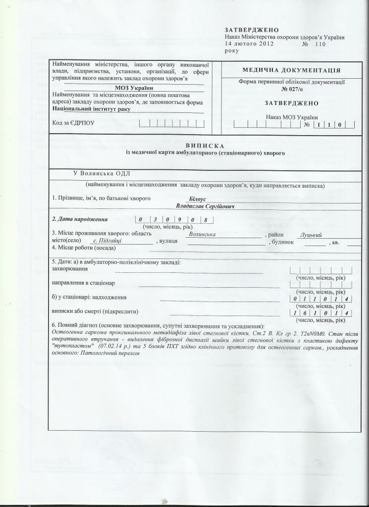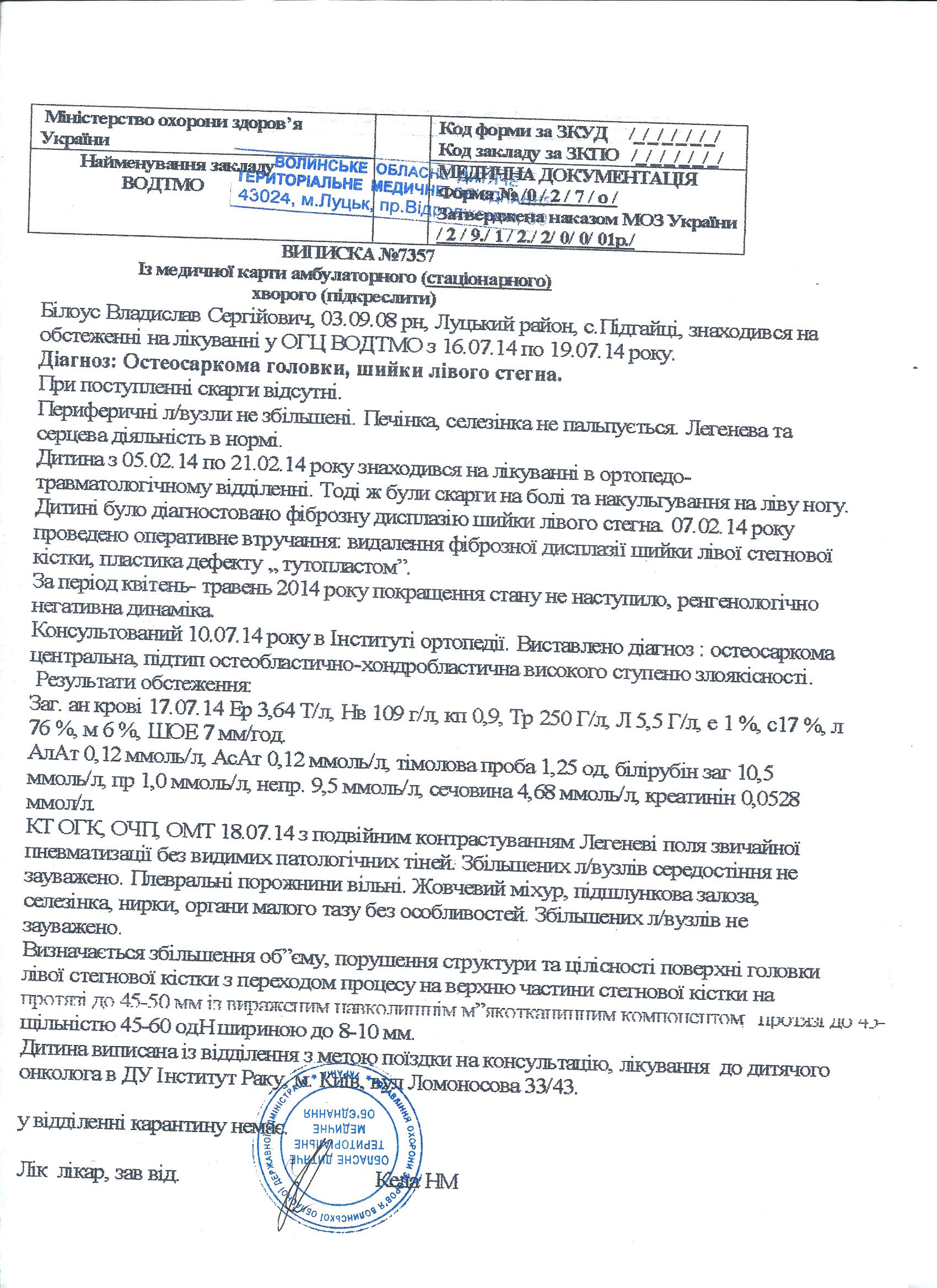 Маленький хлопчик Владик Білоус потребує допомоги. Дитині 6 років, і вона бореться зі страшною хворобою – у Владика остеосаркома шийки лівої стегнової кістки. Владик зараз в Угорщині і потребує дороговартісного лікування та 2 операції.